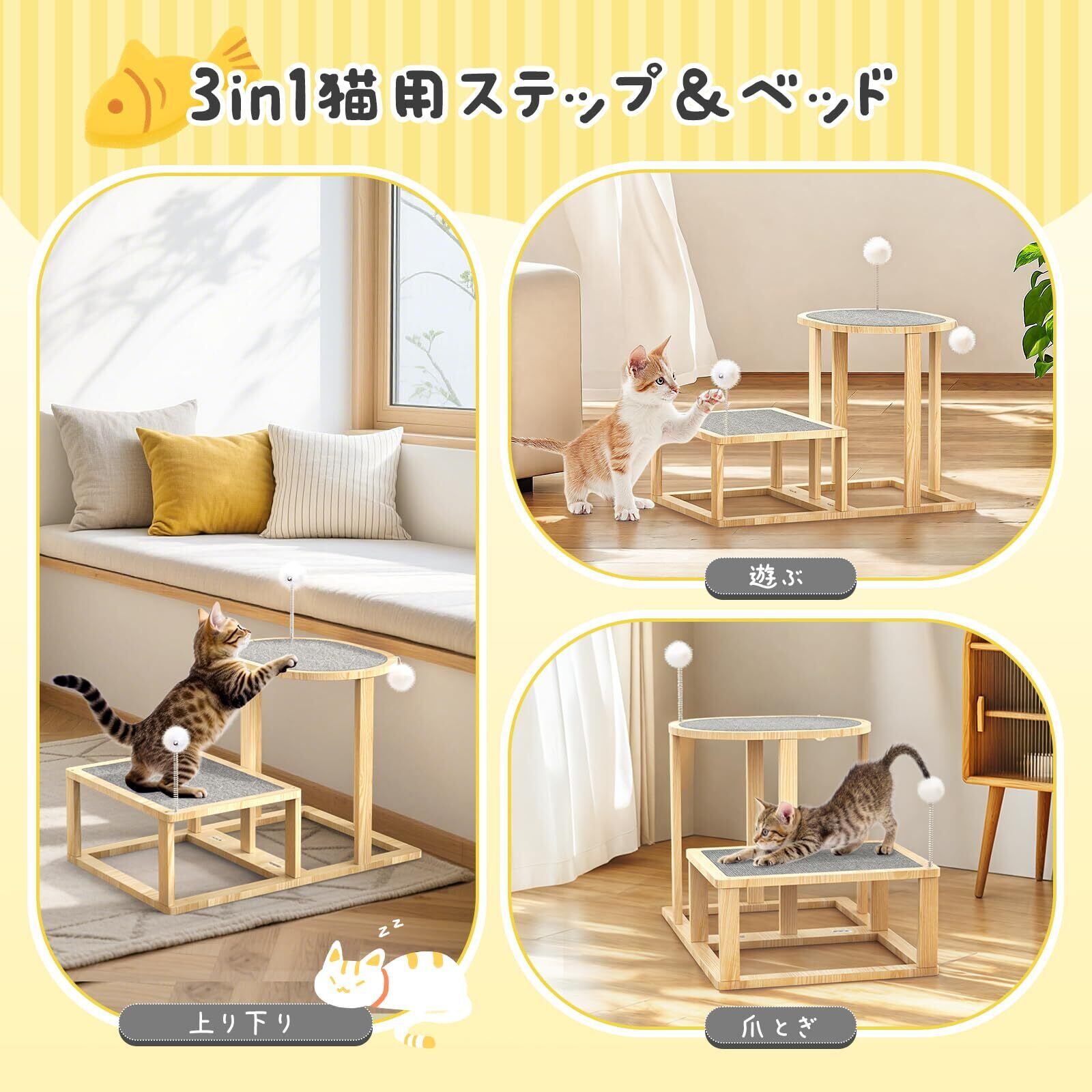 猫 爪研ぎ ベッド Pawaboo つめとぎ 猫 じゃらし付き 爪研ぎベッド 多機能 小型 猫 ベッド 低め ペットステップ 木製 2段 猫爪とぎ ミニ 省スペース ねこベッド 組立簡単 安定性 登りやすい 子猫 老猫 原木色