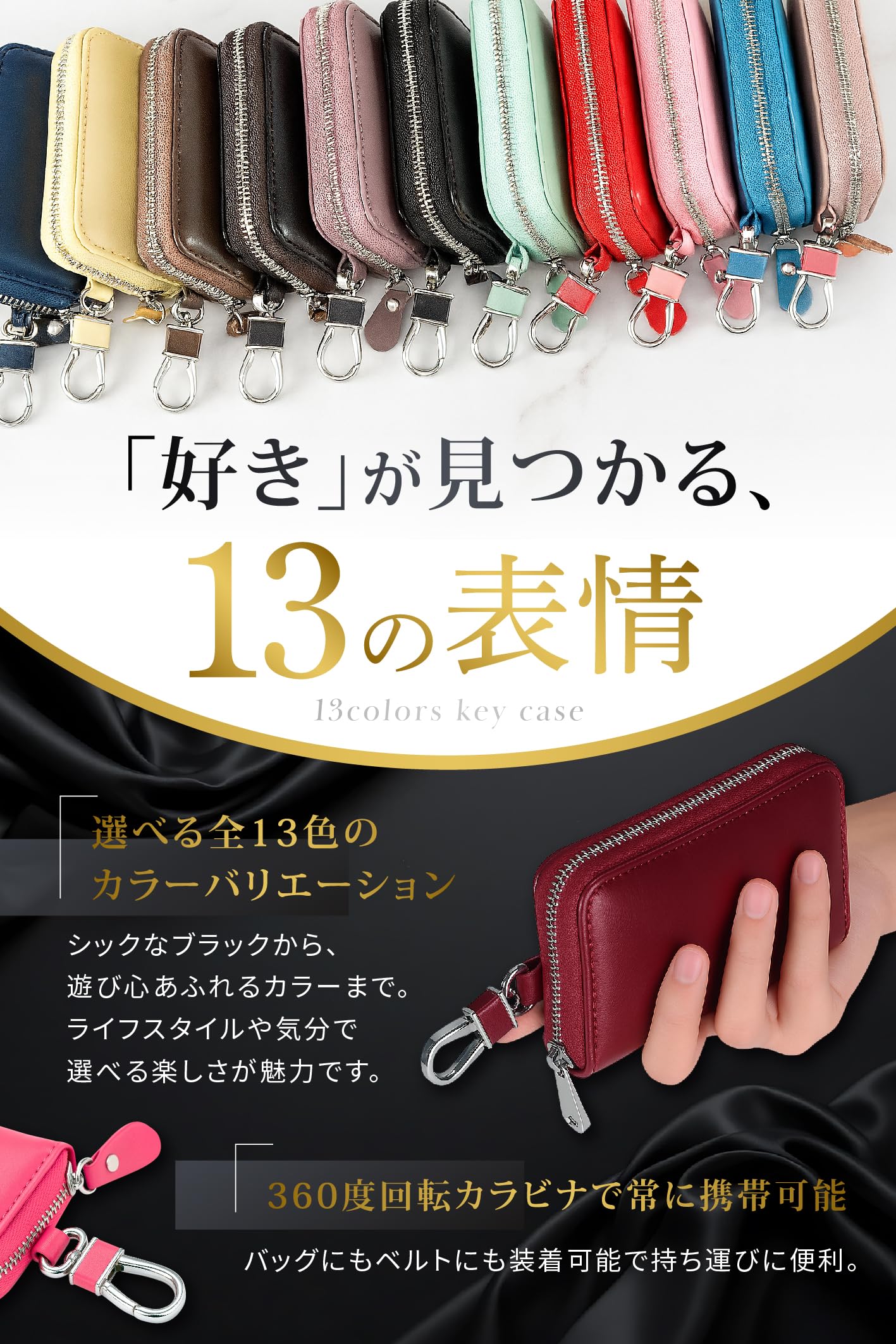 【カラー】PUレザーの質感を生かした13カラーのラインナップです。 Black (ブラック) / Navy (ネイビー) / Red (レッド) / WineRed (ワインレッド) / Brown (ブラウン) / DarkBrown (ダークブラウン) / Pink (ピンク) / DeepPink (ディープピンク) / CreamYellow (クリームイエロー) / MintGreen (ミントグリーン) / TurquoiseBlue (ターコイズブルー) / RoseQuartz(ロースクォーツ) / RosieBrown(ロージーブラウン)【商品詳細】サイズ:11 x 6 x 2.5cm/カードスロット?2/キーフック?6/キーチェーン?1/スマートキースロット?1