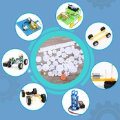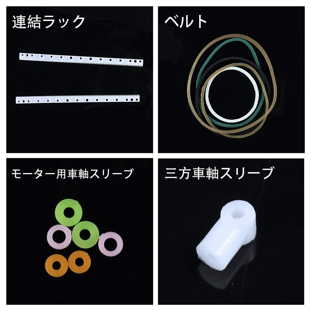 パッケージ:スピンドルギヤ 9種、クラウンギア 11種、平歯車 12種、二段歯車 19種、ベルトプーリ 7種、ウォームギア 2種、6個のモーター用車軸スリーブ 3種、三方車軸スリーブ、ベベルギヤ、連結ラック 2種、ベルト 5種、合計72種あり、75個入り