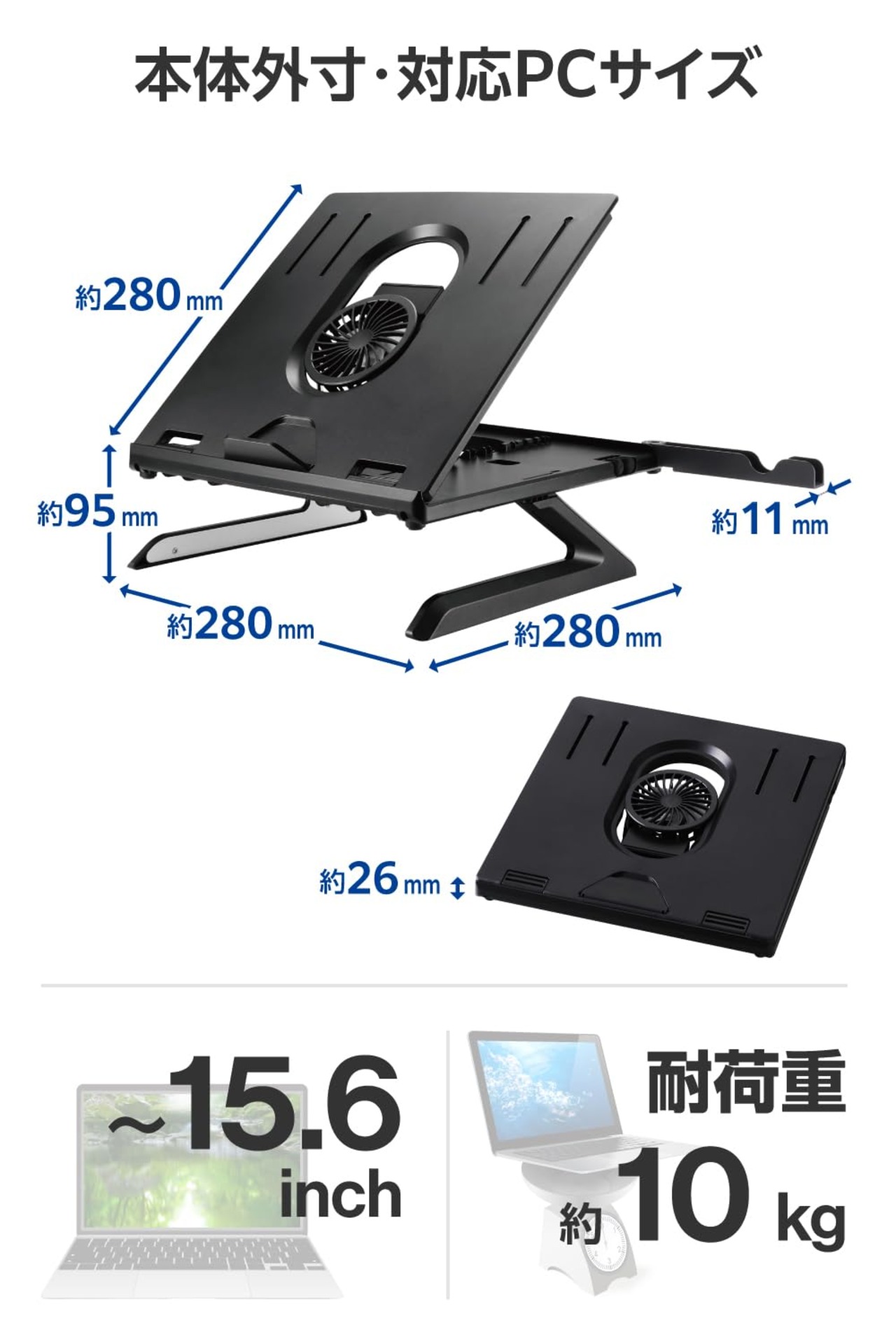 スタンドの中央付近に、ノートパソコンの過熱を防ぐ冷却ファンを搭載。冷やしたい場所に合わせて、上下に位置を調節可能です。