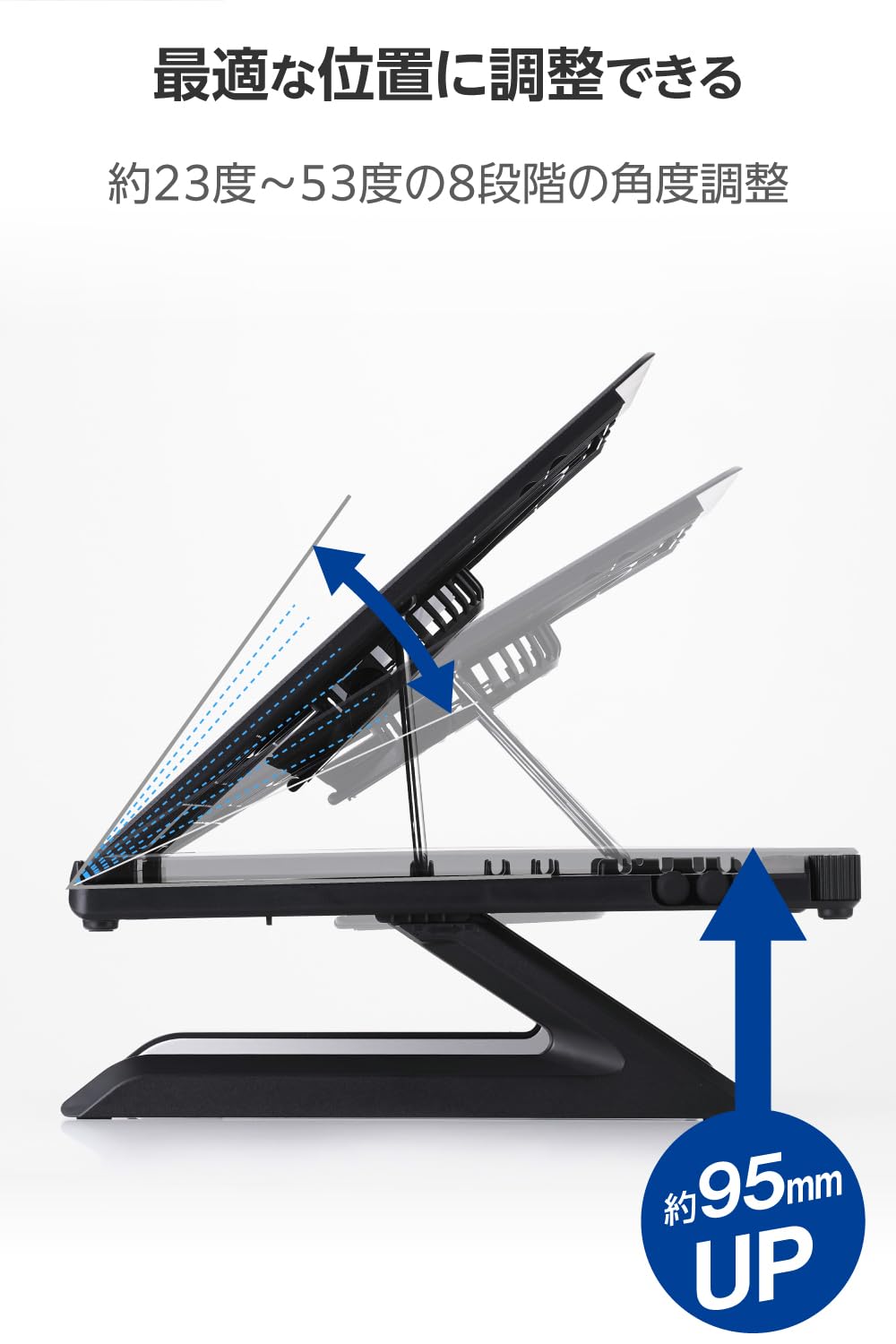■傾斜角度を約23度~53度の8段階に調整可能。用途や姿勢に合わせて、快適な角度で作業できます。