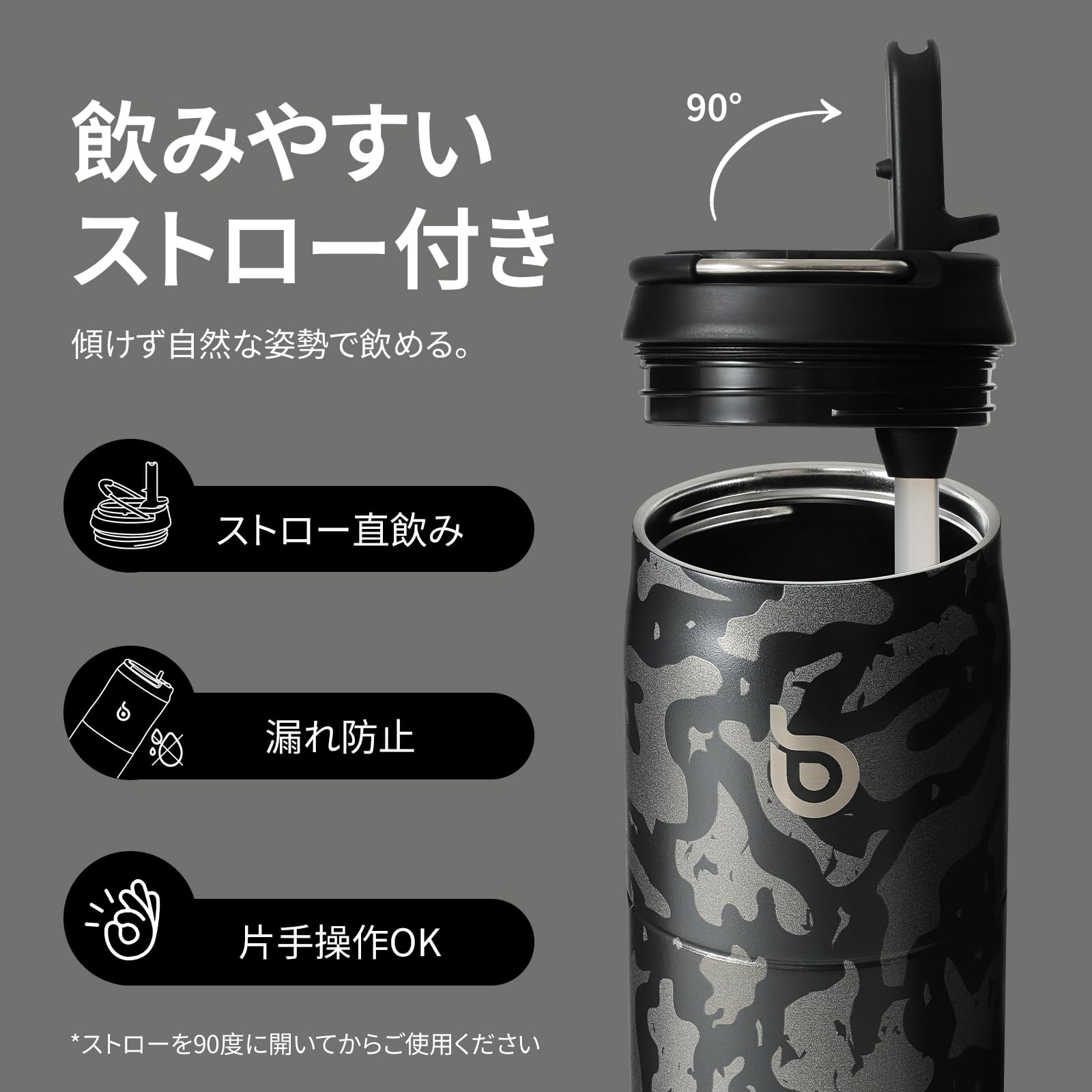 BOTTLE BOTTLE 水筒 1リットル 大容量 1000ml ストロー付き 直飲み 保温保冷 真空断熱 子供 大人 持ち手付き おしゃれ 1L ボトル ステンレス 魔法瓶 二重構造 女の子 男の子 持ち運び スポーツ アウトドア ブラックカモフラージュ