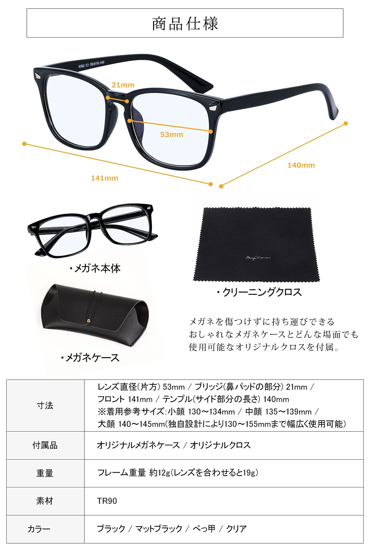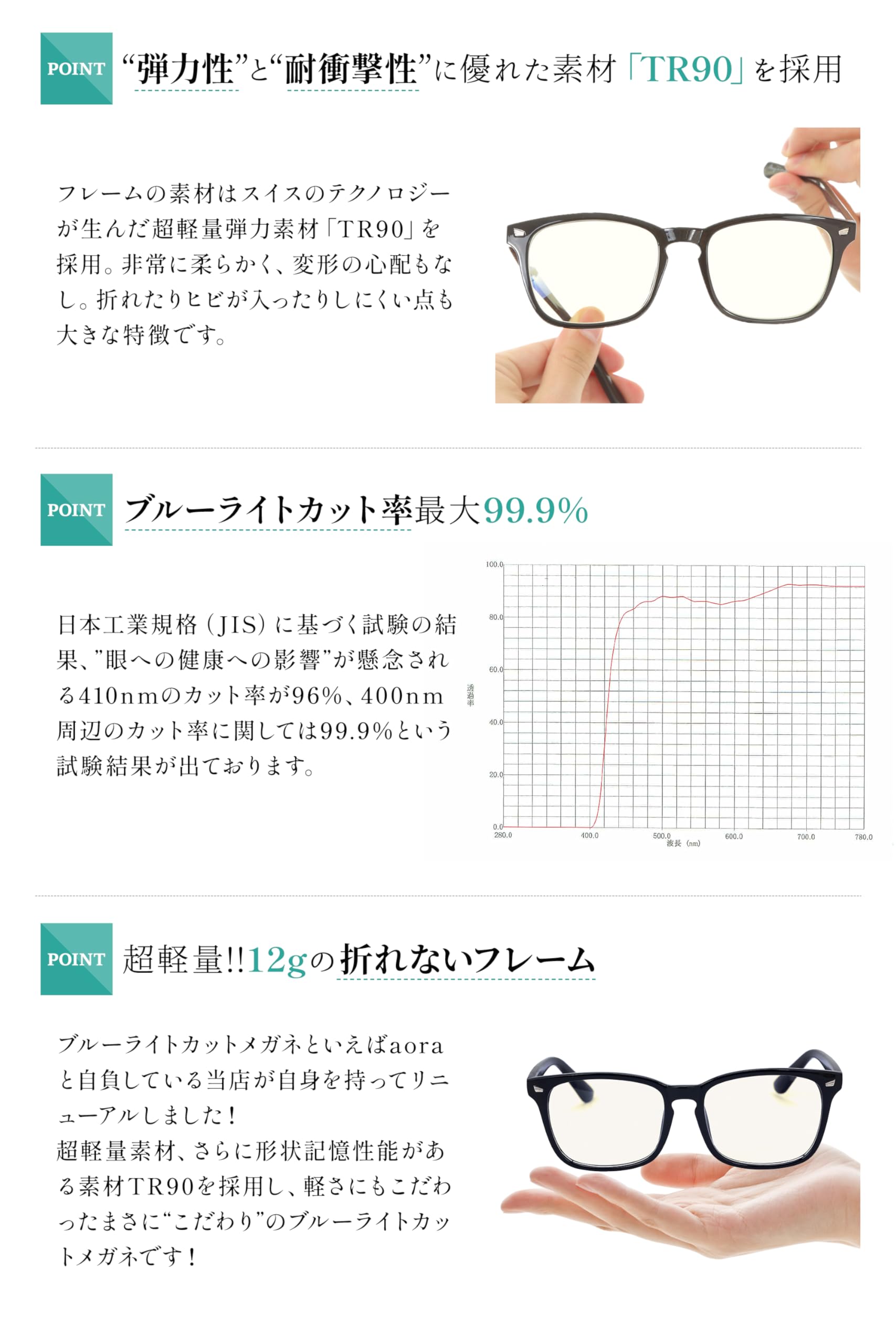「たった12g、かけていることを忘れるほどの軽さ。」TR90素材を採用した超軽量フレームは、驚きの12g。長時間かけても負担を感じにくく、鼻や耳への圧迫感も最小限。フィット感抜群で、激しく動いてもズレにくいから、日常使いはもちろん、スポーツや運転時にも快適。まるで空気のようなかけ心地を、ぜひ体感してください!