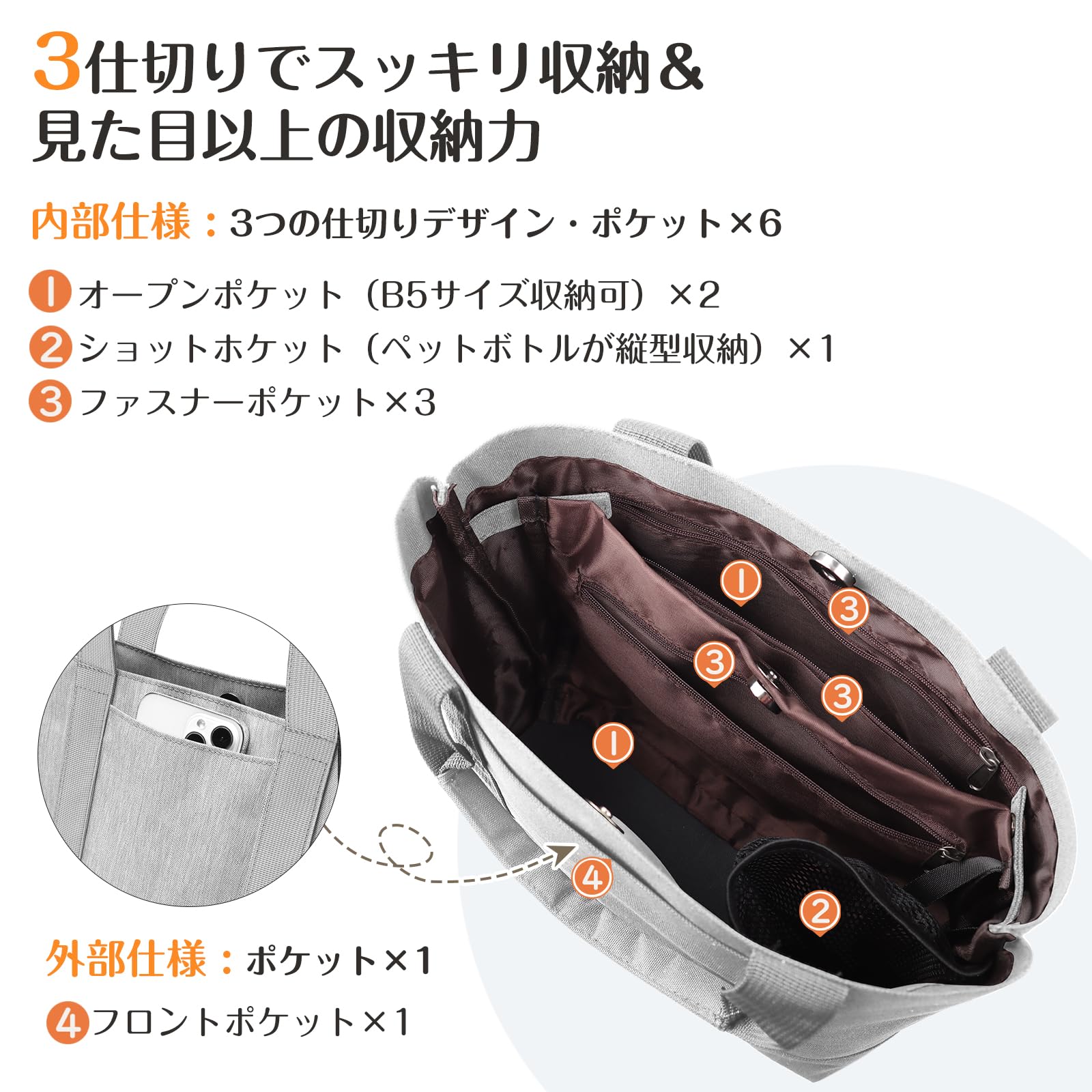 【3仕切りでスッキリ収納】ENLANトートバッグには3つの仕切りと7つのポケットがあり、荷物はサッと入れやすく、スッキリかつ楽に収納できます。荷物は綺麗に整理整頓して入れられる手提げバッグです。またペットボトルは立てて収納できてより便利に使用できます。普段使いにも、通勤バックにも使えます。