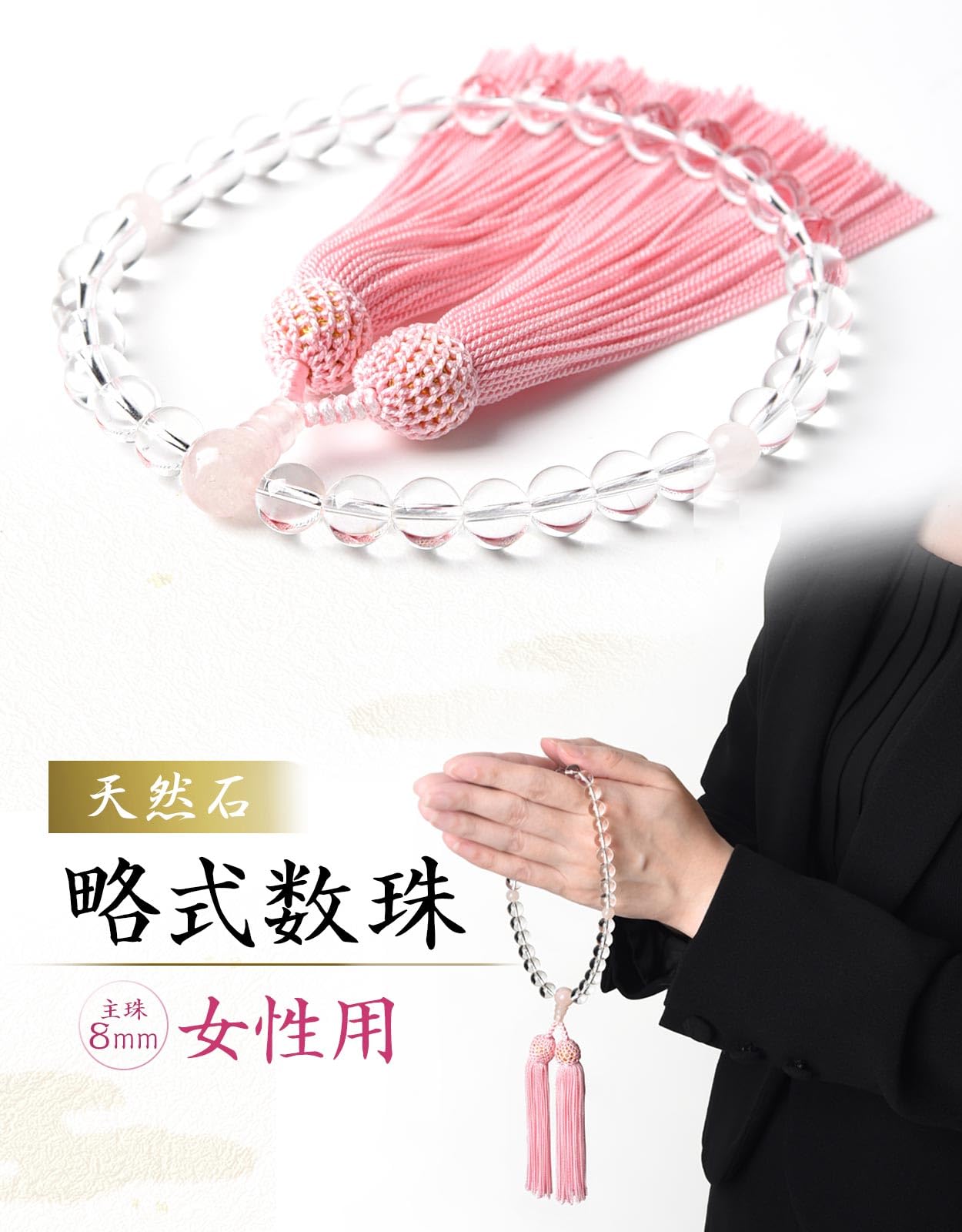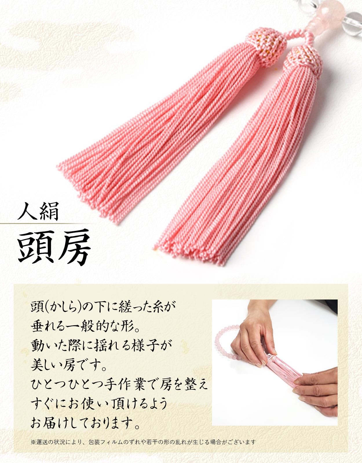 数珠の素材:本水晶/紅水晶…主珠:8mm玉、親珠:10mm玉、天珠:6mm玉、人絹頭付房