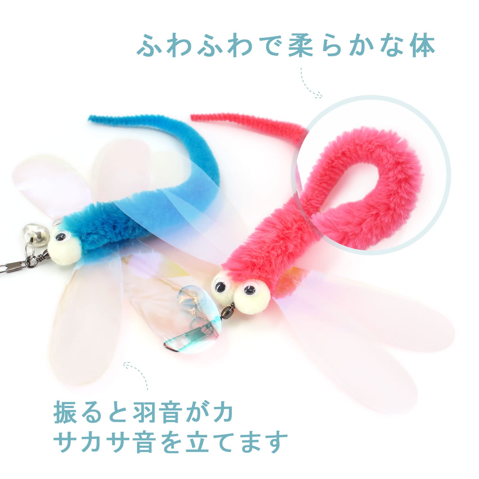 猫のおもちゃ:トンボのような飛び方と羽の音が猫達を興奮させてよく遊んでくれます。トンボの虫のように作り、羽のキラキラさを感じと、しっかり猫たちは食いつきます。猫に無害な材質を使用しており、健康を維持するのに、最適な猫おもちゃです。