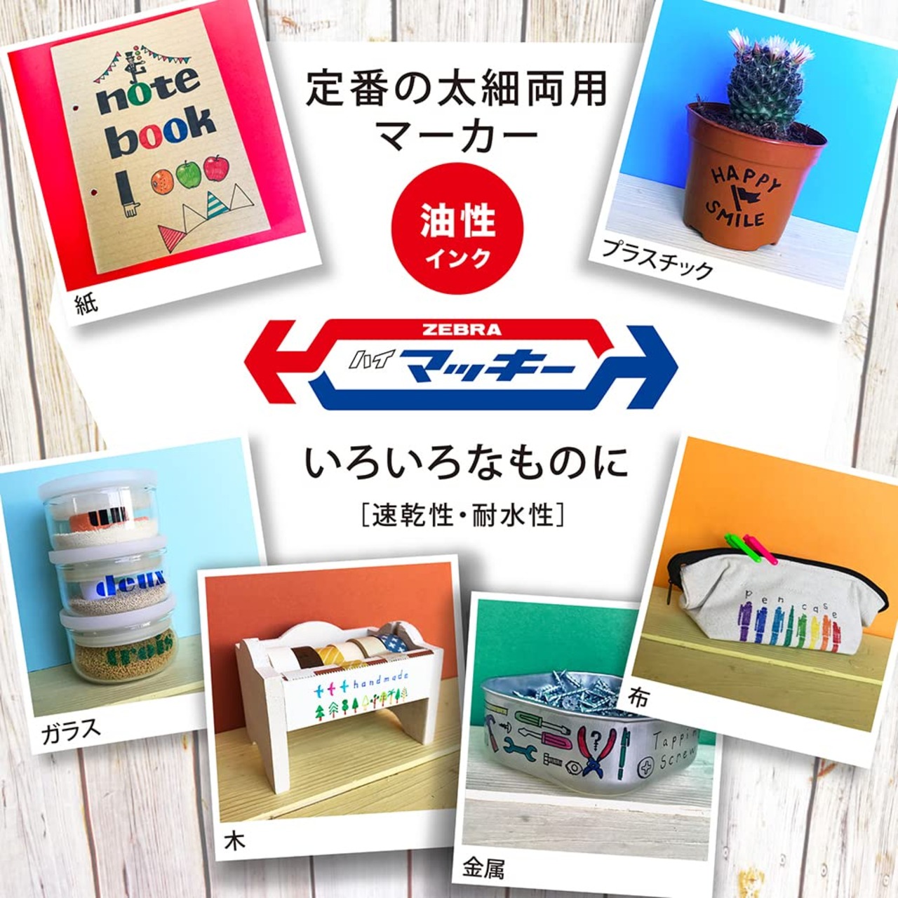 速乾性・耐水性で、紙・布・木・ダンボール・ガラス・プラスチック・金属・ビニール類などに幅広く利用できる。(浮輪等の軟質塩化ビニール製品には適しません。)