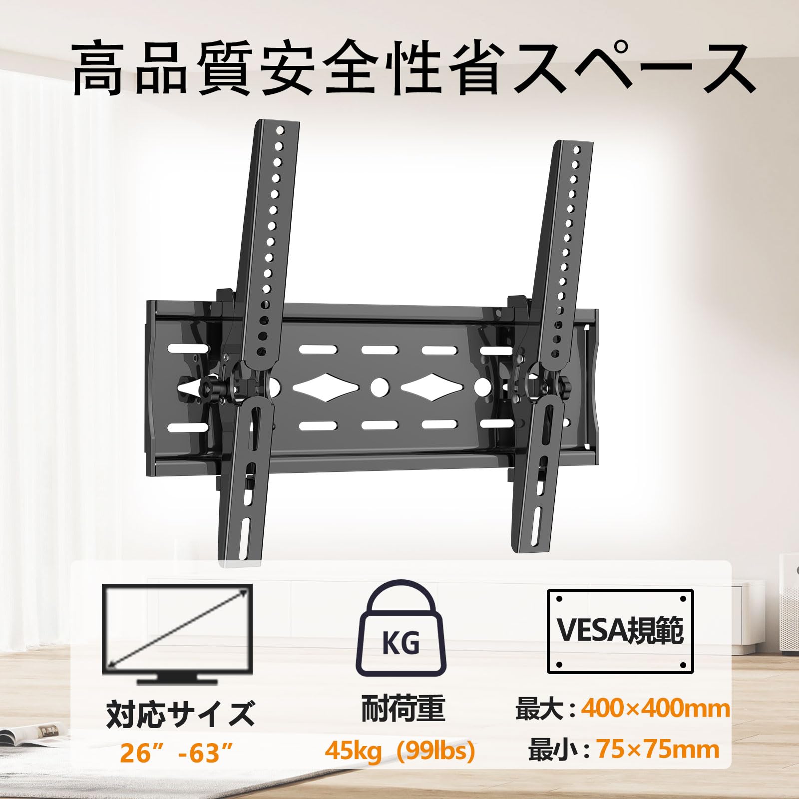 JXMTSPW壁掛けテレビ金具 26~63インチ対応 薄型 ティルト式 45kg耐荷重 tv壁掛け金具 テレビかべかけ金具 上下±15度角度調節 VESA75x75~400x400mmティルト壁掛けTV金具