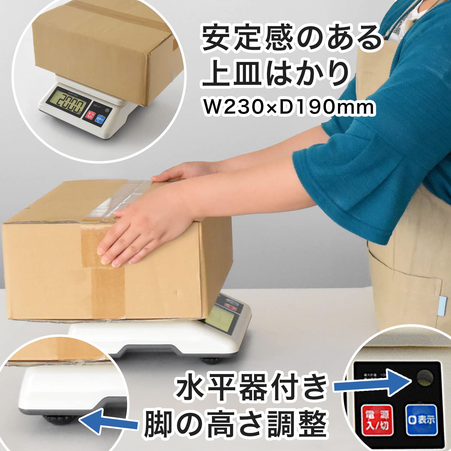 皿はかり部分が大きく、荷物を安定して測ることができます。防滴仕様(IPX2)のため、濡れた手で操作しても問題ありません。水平器が付いており、脚の高さを調整することでより安定した計量ができます。