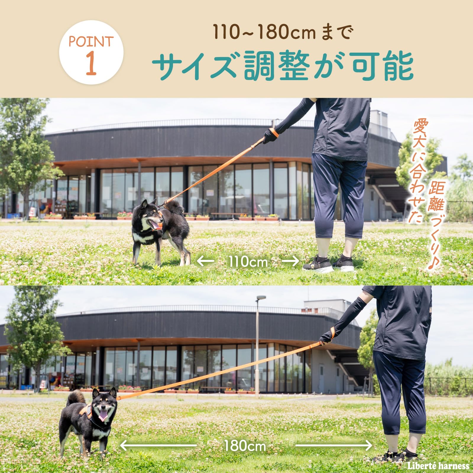 【1本で110〜180cmまで自由に調節】伸ばして縮めて、愛犬との安全で心地良い距離感をキープ。使うシーンや愛犬の性格に合わせてリードの長さを簡単に調節できます。