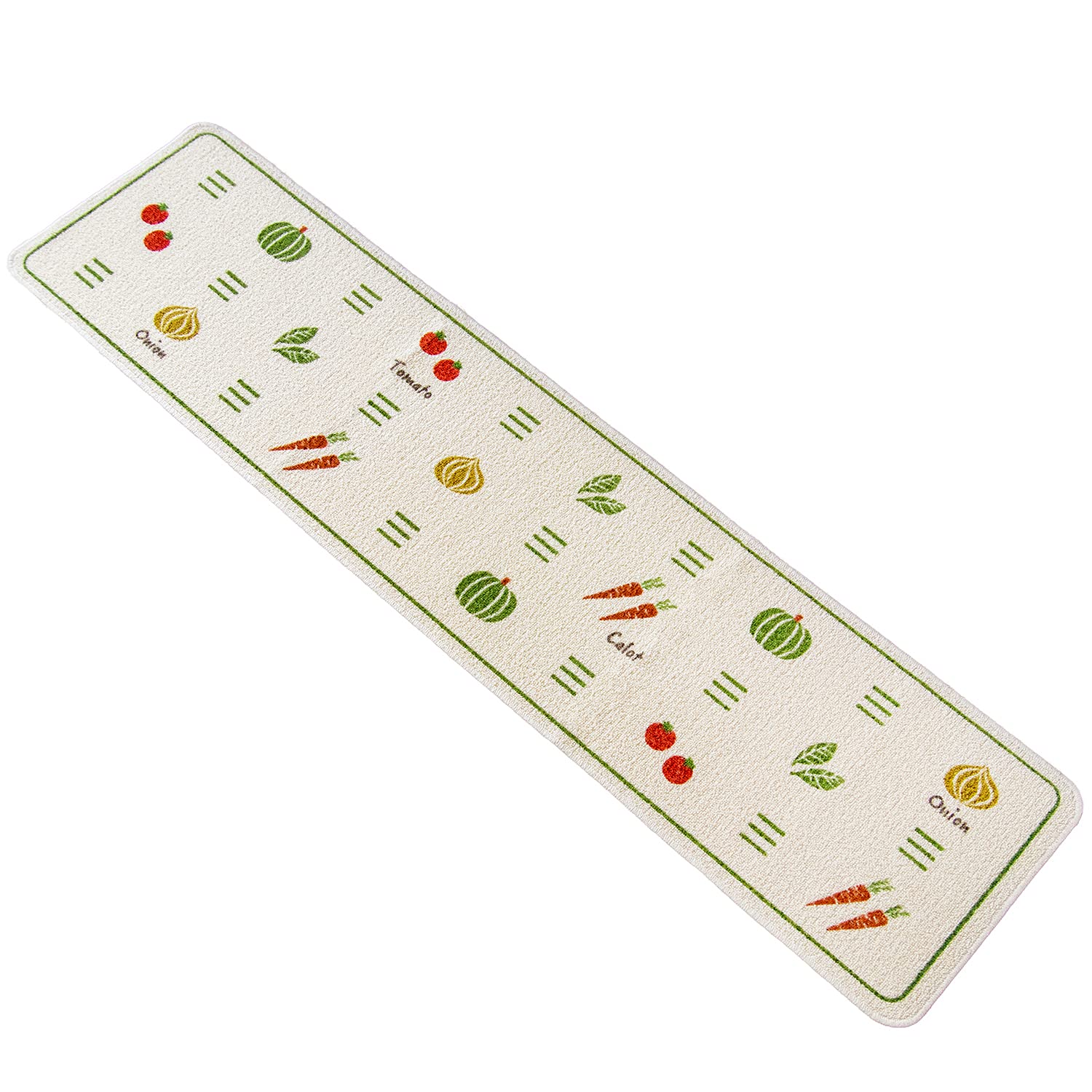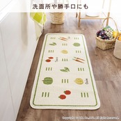 手描きの野菜がり済みよく並んでいるデザインのキッチンマットです。