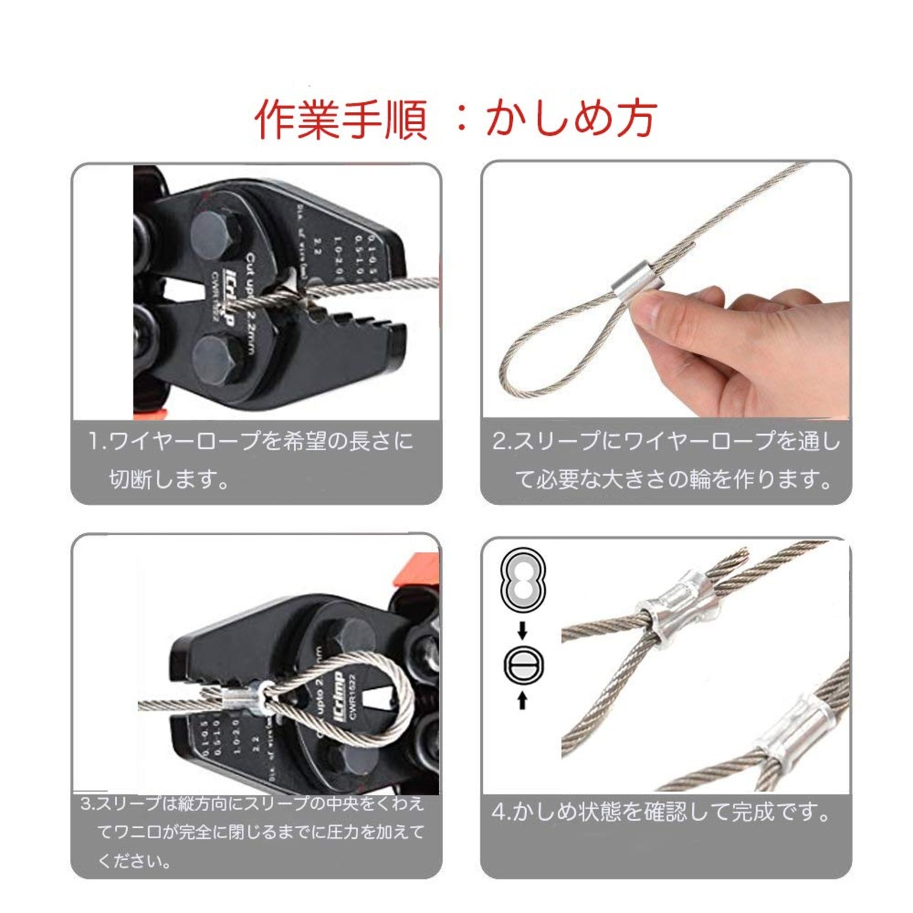 適合:8文字型、丸型、楕円型アルミスリープ(もしくは銅製スリープ、クランプ管)