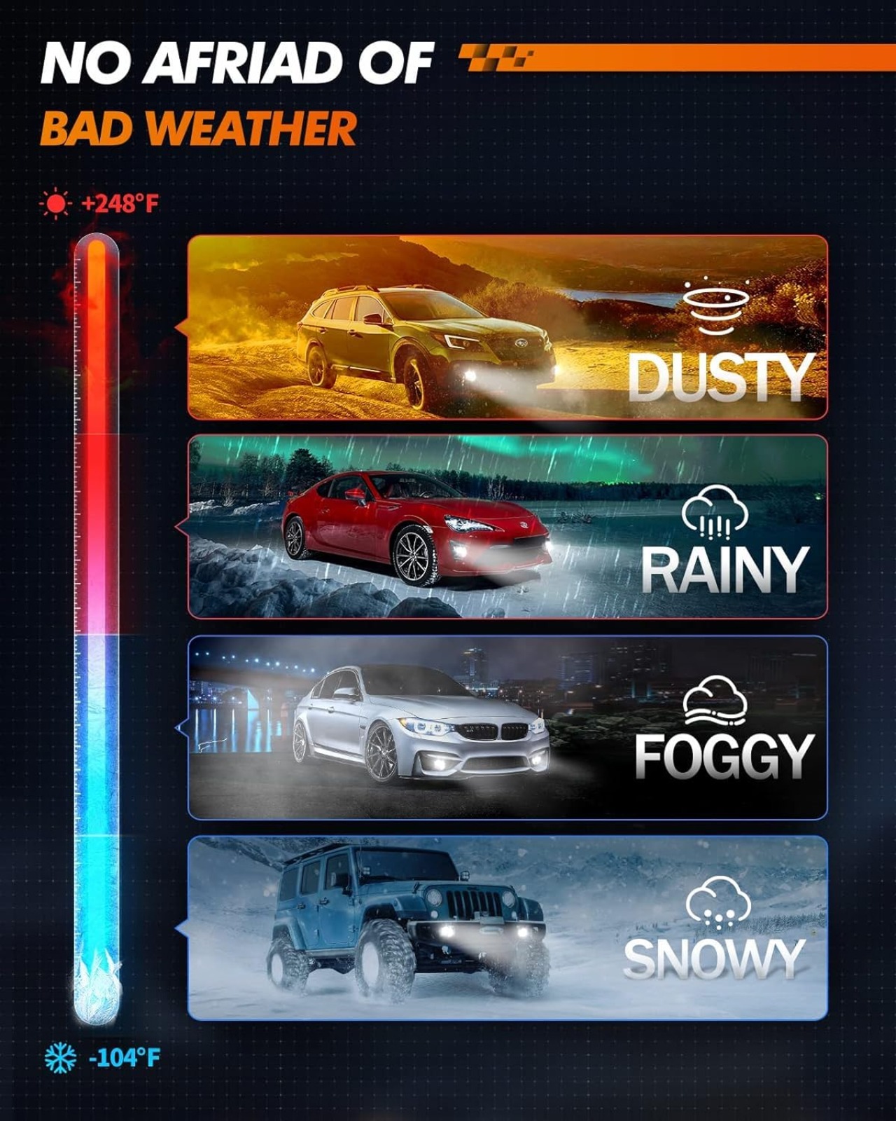 【より長持ち | 50,000時間以上の寿命】: 6063航空アルミボディデザインは、良好な熱伝導性を持っています。高温耐老化ゴムリングを備えており、水やその他の汚染物質を外に出すことができます。これにより、照明システムのシールを保つのに役立ち、日常的な使用の摩耗に耐えることができます。 従来のフォグランプに比べて、よりも長い寿命を持ち、これは、交換の頻度を減らし、ランプの寿命に関連する手間やコストを節約できます。 より効率的なエネルギー利用が可能で、車両のバッテリーの寿命を延ばし、燃費を向上させることができます。また、エネルギー効率の高いフォグランプは、環境にやさしい選択肢です。