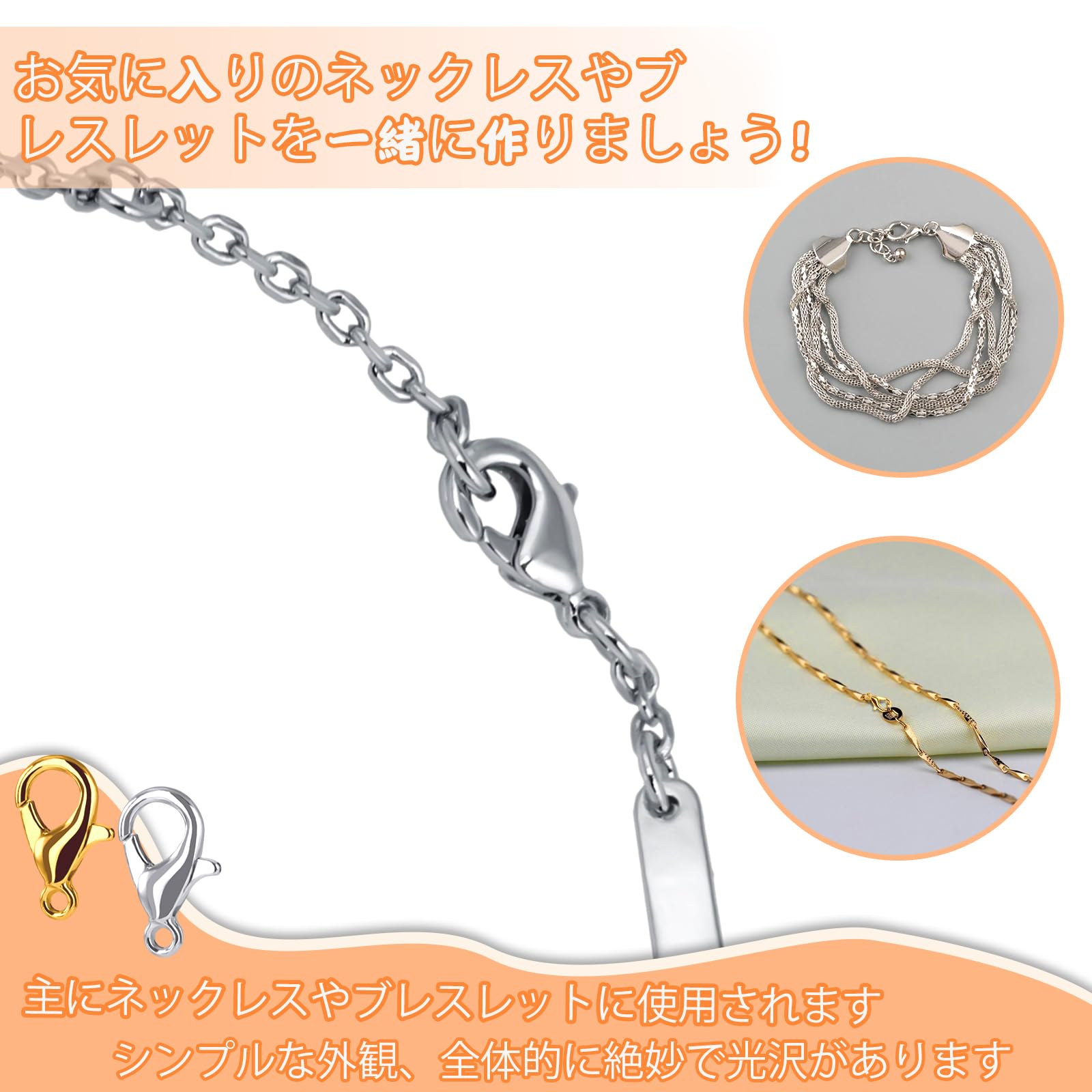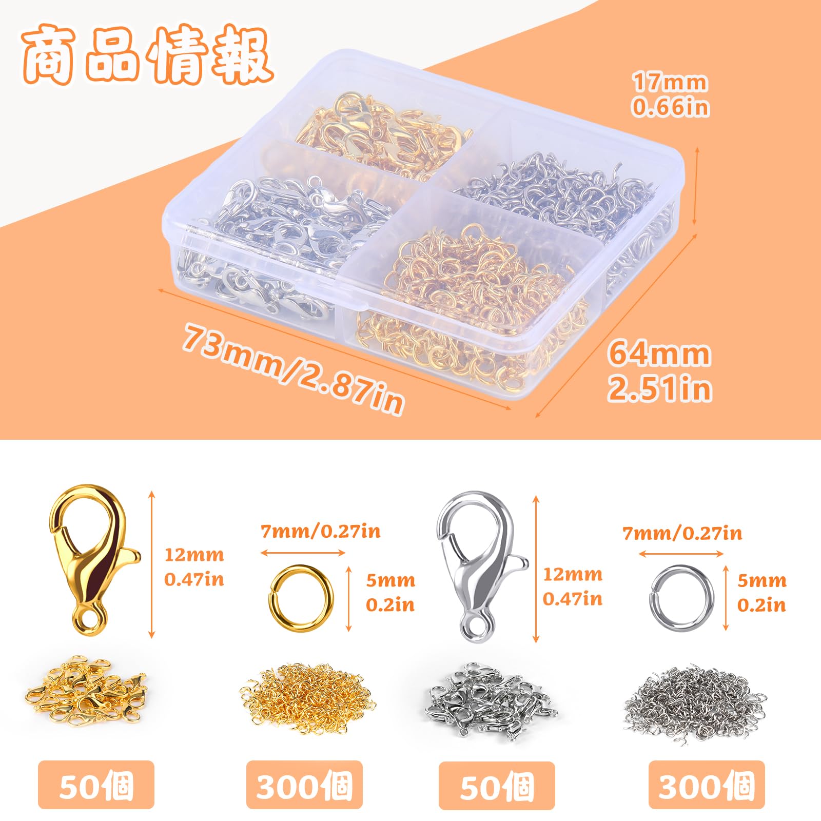サイズ: 当社のカニカン金具とスプリットリングはゴールドとシルバーからお選びいただけます。両方の色のロブスター クロー クラスプは 0.47 インチ/12mm の長さで、オープン ジャンプ リングは直径約 7 x 5mm で、ネックレス留め具 プロジェクトの接続やジュエリー関連プロジェクトの作成に適しています