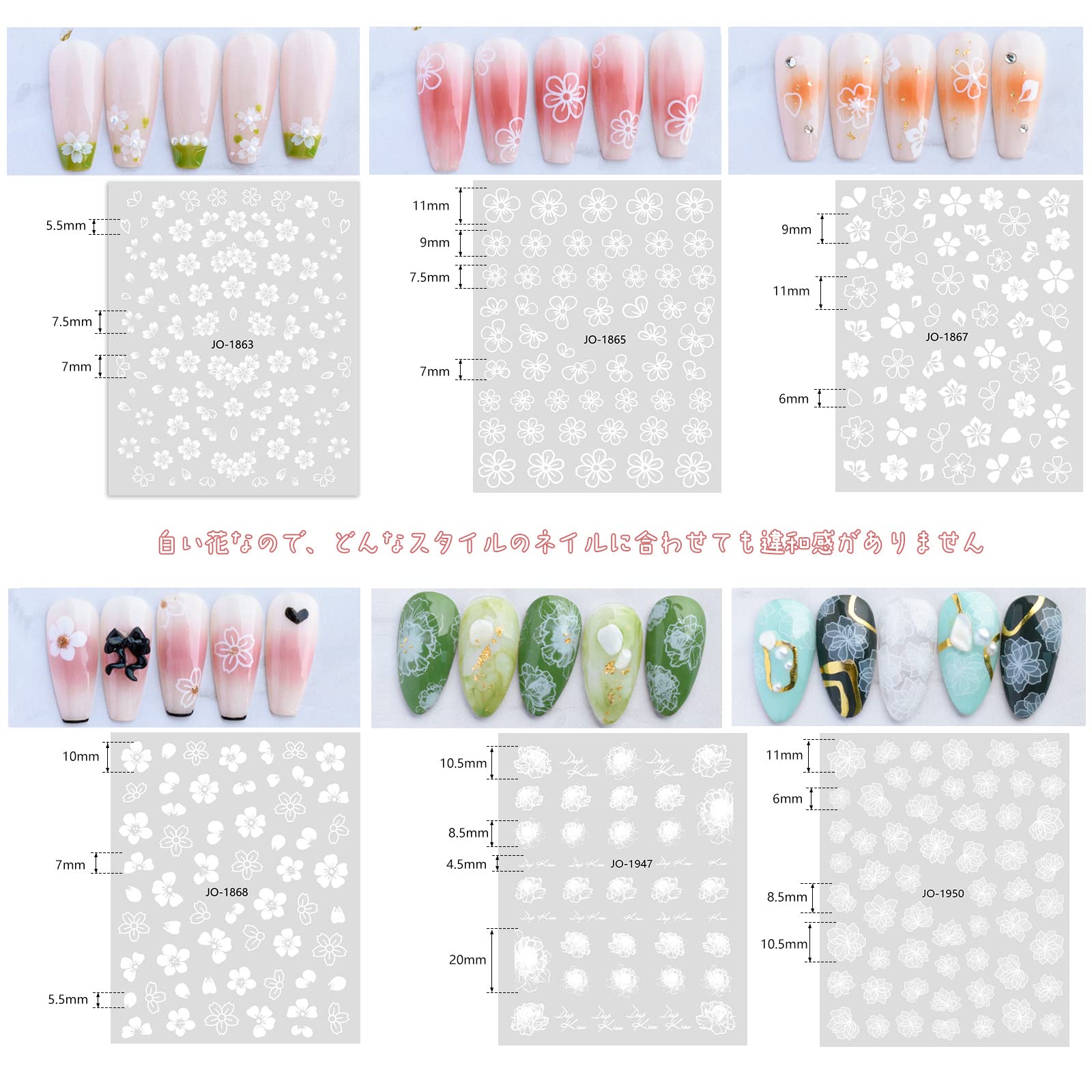 【6枚セット】ネイルシール 白い花6枚入。爪にやさしいPVC素材を使用しており、安心にご購入頂けます