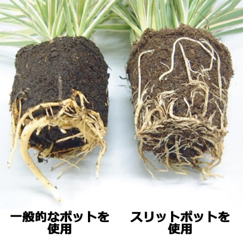 理想的な根はりを実現できる話題のポット 【特徴】 ・スリットポットは地植えをした時の根はりと同じ状況を実現するために設計された理想的な鉢です。 ・一般的な鉢に植えた場合、水分や養分を求めて植物の根が鉢の中をぐるぐると、とぐろを巻くように伸びてしまいます。 これを「サークリング現象(ルーピング現象)」と呼び、この現象が起こると水分や養分を植物自ら吸収する力をが落ちてしまい、弱ってしまいます。 鉢底にスリットが入っていることで、底に溜まる水分を除き、酸素を取り込めるようになっているので、根が健全な状態で生長します。 商品サイズ 外寸105×底寸75×高さ90mm 【注意事項】 使用に際しては必ずをよく読んで、記載内容に従ってご使用ください