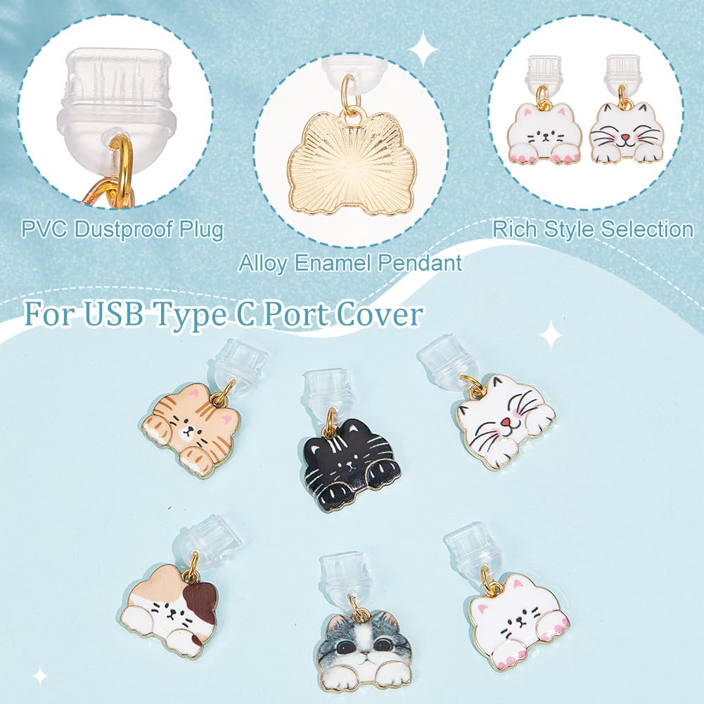 OLYCRAFT 6個 コネクタカバー Type-C キャップ USB チャーム 可愛い猫 PVCキャップ カラフル かわいい 防塵プラグ 携帯Type C充電穴キャップ ペンダント 保護 防塵カバー スマートフォン用