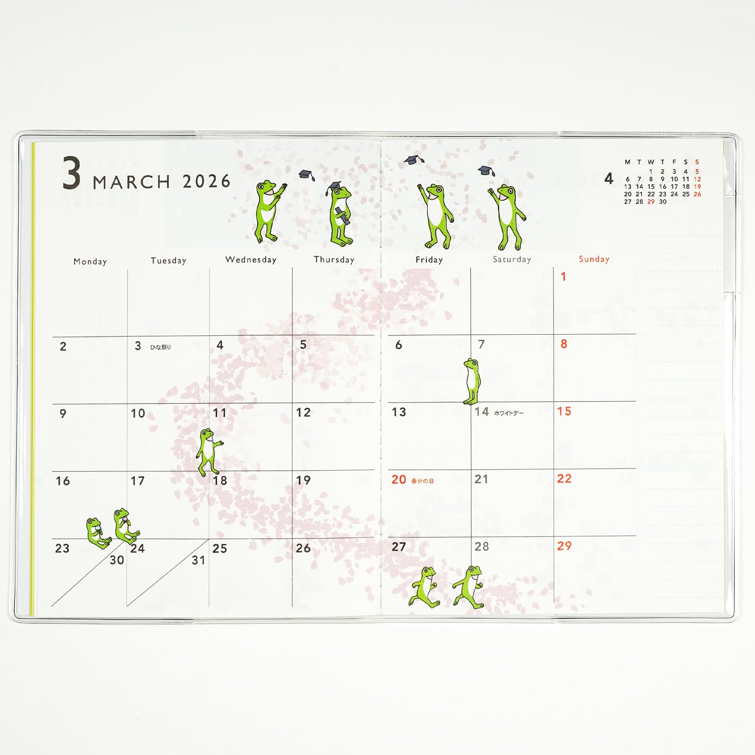 かえるたちが一年を満喫している様子がとってもユーモラスで季節感たっぷりのA6ダイアリー。コンパクトなA6サイズ。毎月楽しいイラストを全ページフルカラーで楽しめます。ソフトカバーにはペンホルダーがついており、持ち運びに最適です。【仕様】●サイズ:A6サイズ ソフトカバー(ペンホルダー付)●月間:1ヵ月ブロック(2026.1~2026.12)●全48ぺージ(フルカラー)●年間カレンダー、年間ブロックカレンダー、メモページ(16ページ)、パーソナルメモ、アニバーサリーリスト