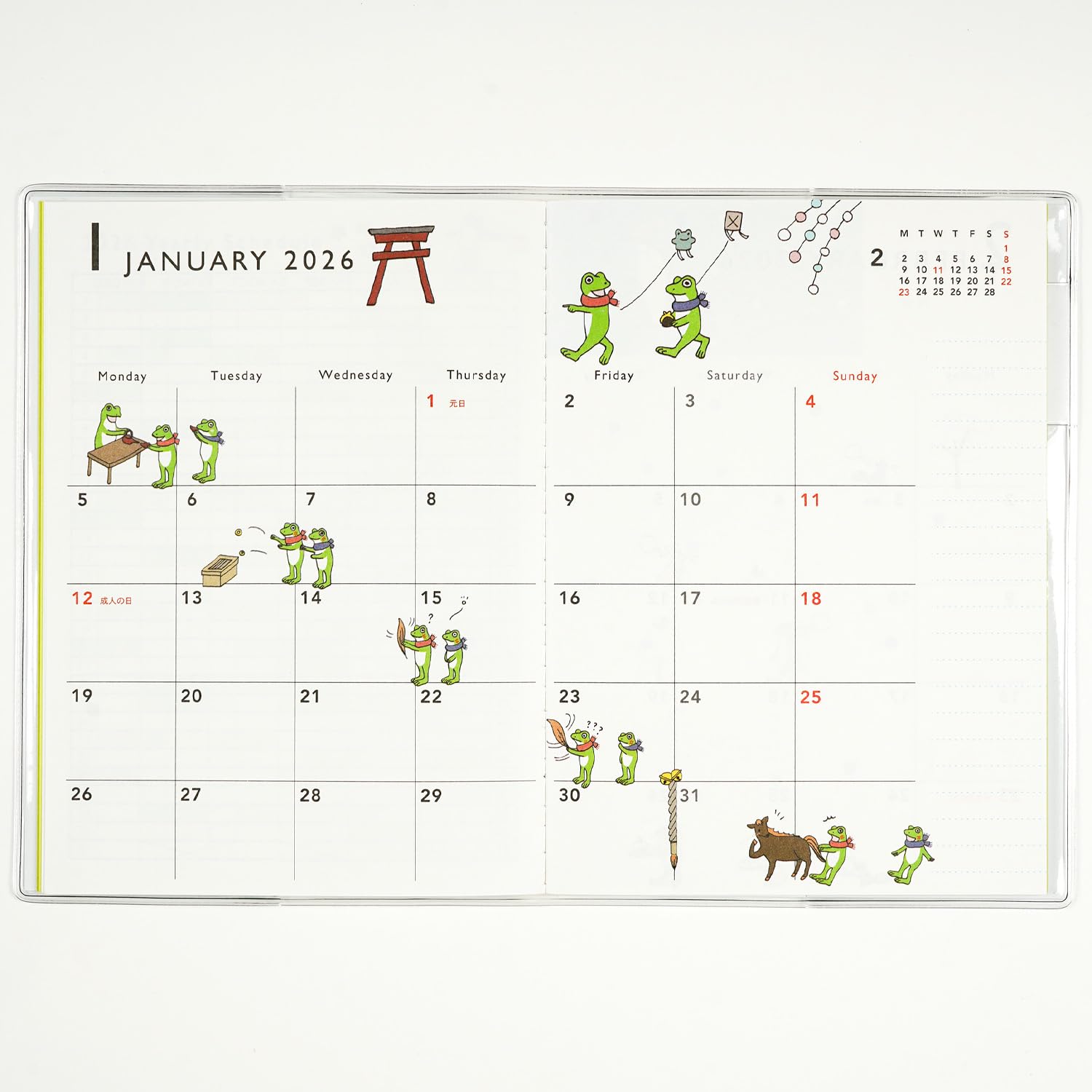 かえるたちが一年を満喫している様子がとってもユーモラスで季節感たっぷりのA6ダイアリー