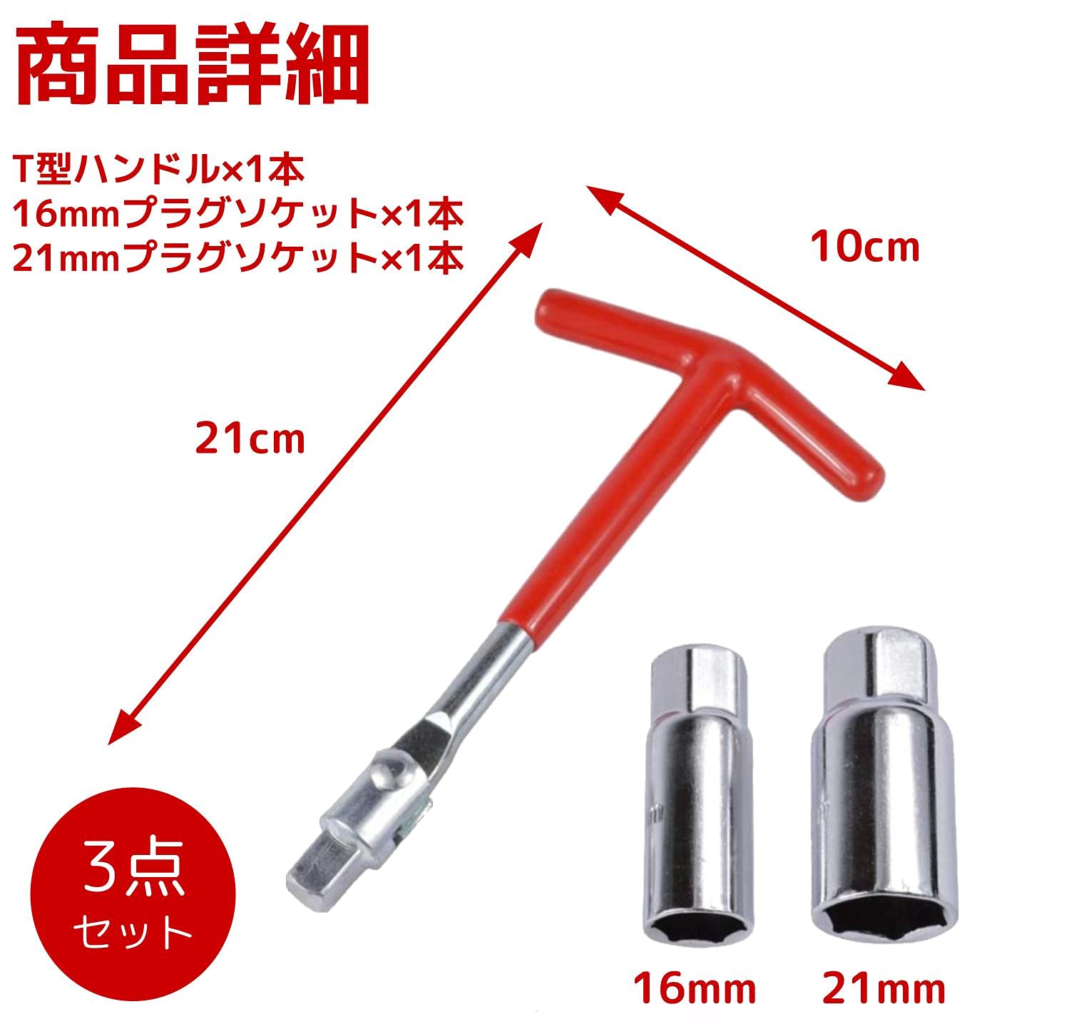 【商品詳細】商品内容:T型ハンドル1本,16mmプラグソケット1本,21mmプラグソケット1本、ハンドルサイズ:長さ21cm,ハンドル幅:10cm