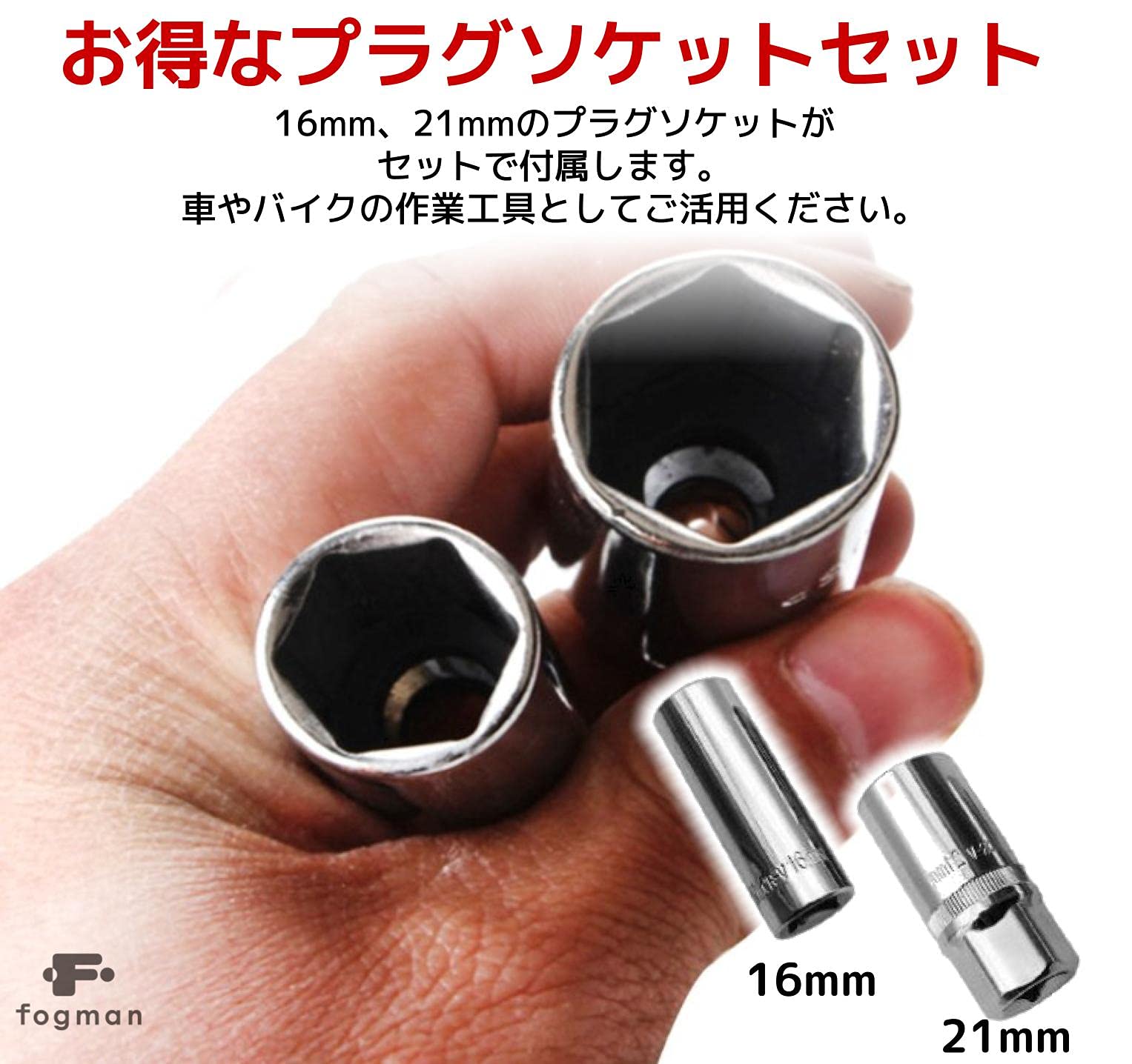 【ソケットのセット】ソケットは、16mmと21mmの2つで一般的に良く使用されるサイズをセットにしました。ラバーキャッチタイプでプラグを傷つける事なく保持できます。