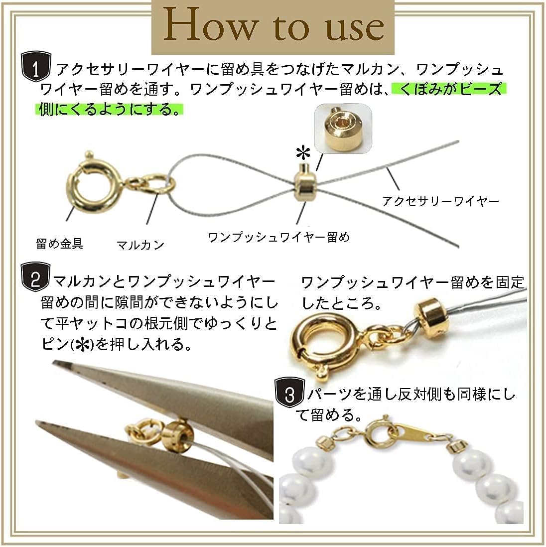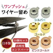 【日本製ワンプッシュ ワイヤー留め金具】 アクセサリーやハンドメイド作品の仕上げに最適な国産エンドパーツです。ワイヤーやテグスの端を美しく・確実に固定できるワンプッシュ構造。つぶし玉やボールチップを使わずに、ペンチで軽く押すだけで簡単に留まります。初心者の方からプロ作家まで幅広く支持されています。