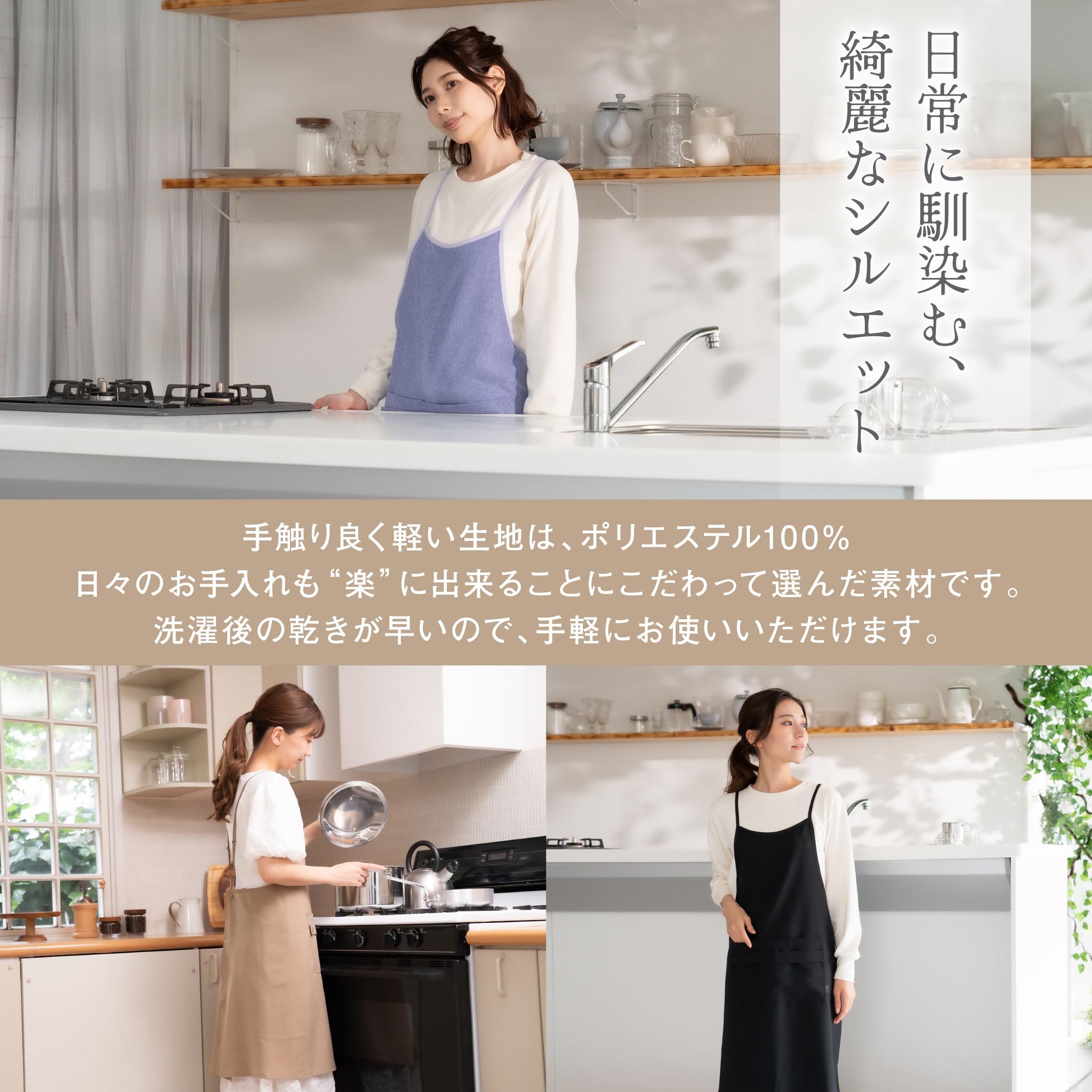 楽に着られる、お手入れ簡単エプロン「KIRAKU(キラク)」。 日常で使いやすく、気楽に着られることにこだわって作ったエプロンです。