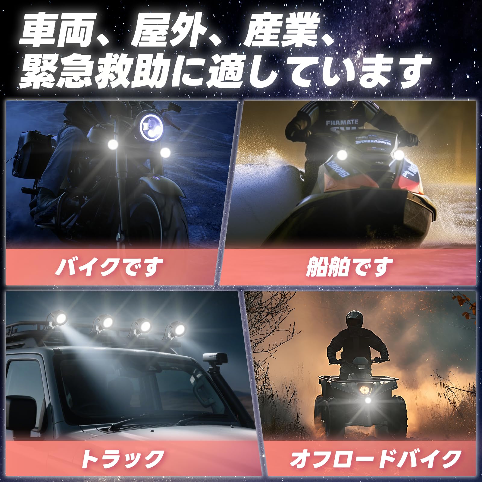 【多用途対応で幅広いシーンで活躍】 フォグランプや作業灯としてだけでなく、夜釣り・集魚ライト、災害時の防災用、農業・建設機械の照明、工事現場や交通整理まで、あらゆるシーンに対応。ホワイト/イエロー2色の点灯カラーから選べ、DC12V/24V兼用(10V〜30V対応)で汎用性も抜群。2個セットでより広範囲を明るく照らします!