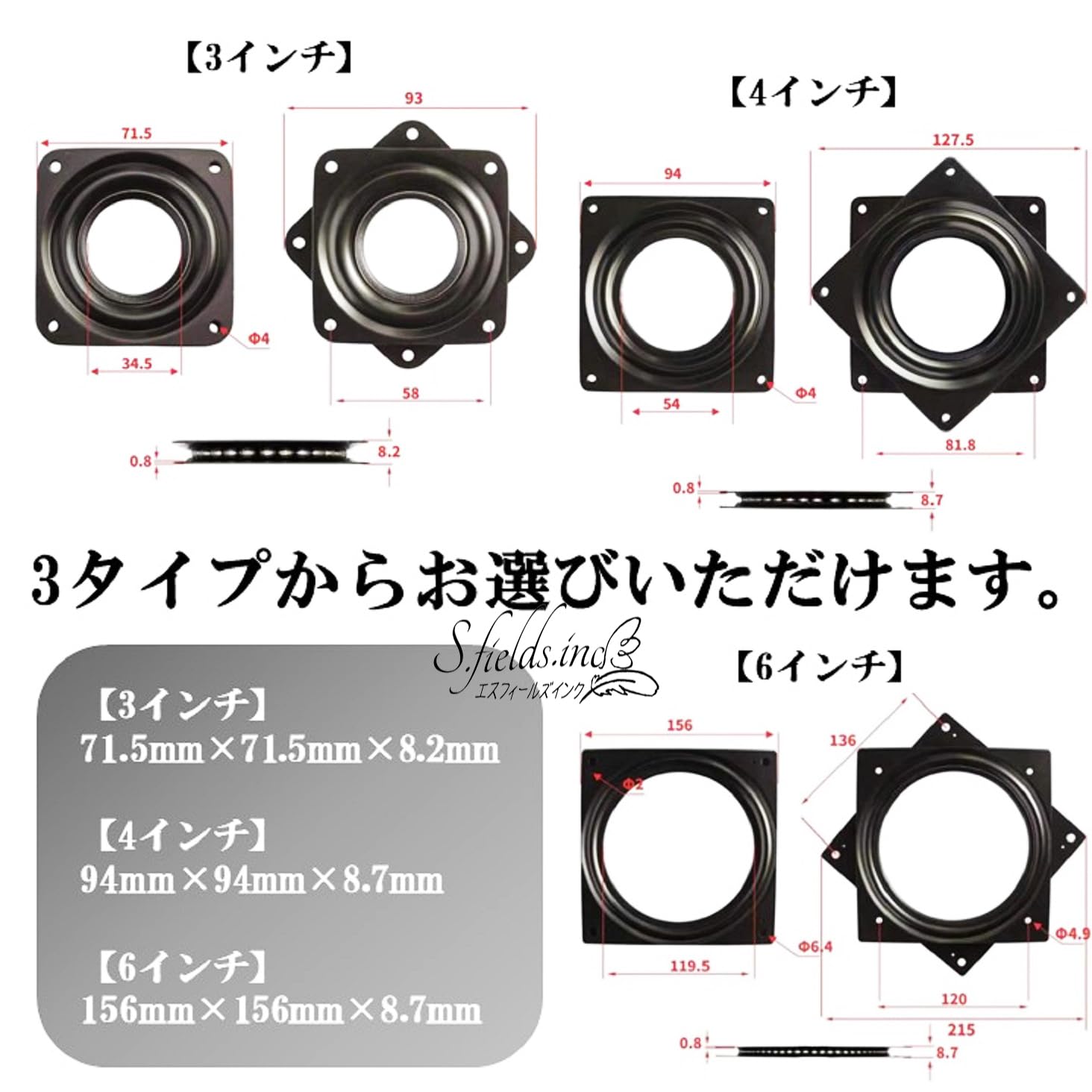 椅子の修理や回転テーブルなどのDIY用鋼製回転盤です。[3インチ][4インチ][6インチ]の3タイプからお選びいただけます。