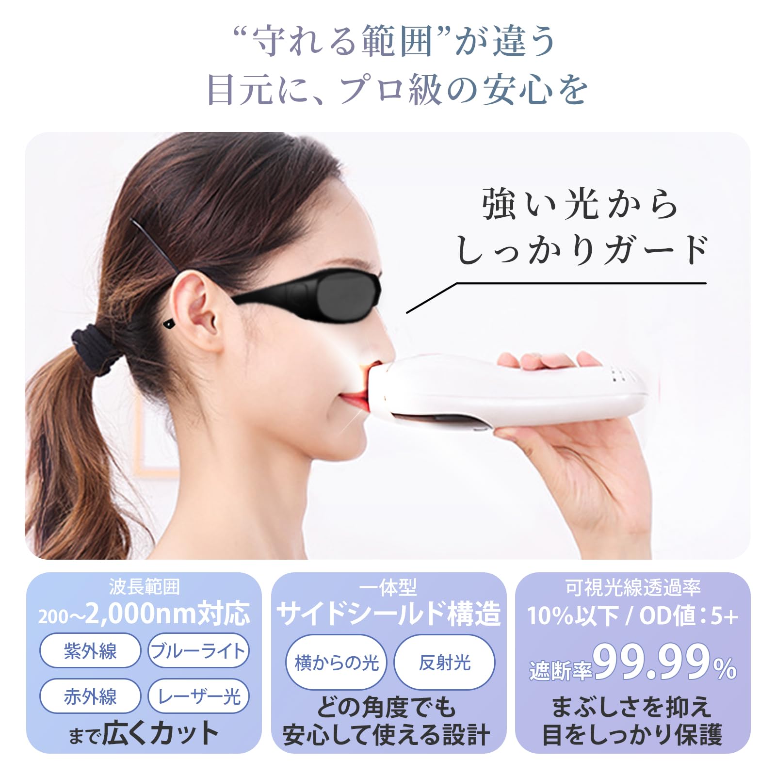 【大切な目を守る安心設計】光の刺激をしっかり防ぐ構造で、脱毛時のまぶしさを軽減しながら肌への影響も抑えることができ、長時間の使用にも安心です。