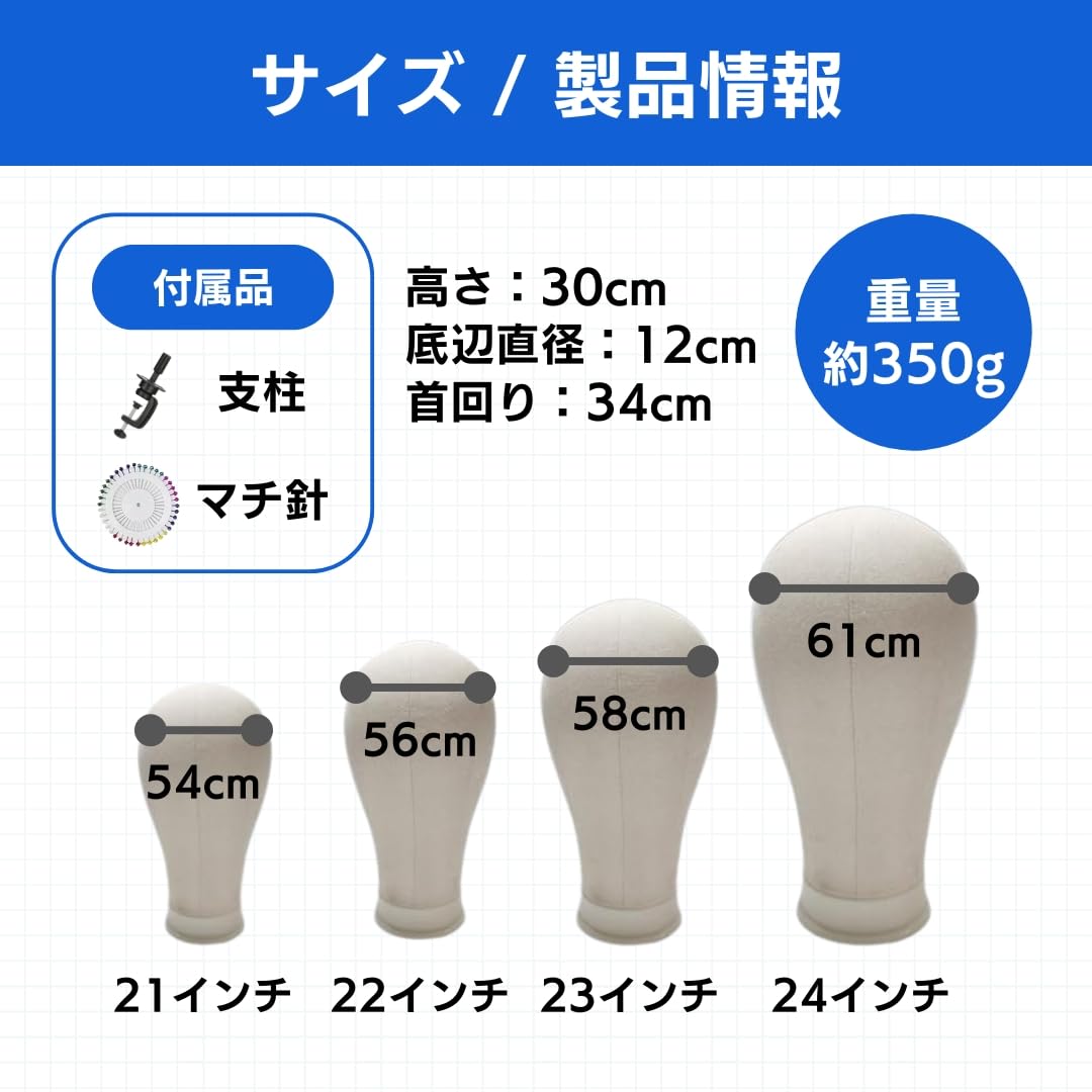 【サイズ】高さ=30cm 底辺直径=12cm 首回り=34cm 重量:約350g・21インチ 頭部=54cm・22インチ 頭部=56cm・23インチ 頭部=58cm・24インチ 頭部=61cm「付属品」・支柱・マチ針