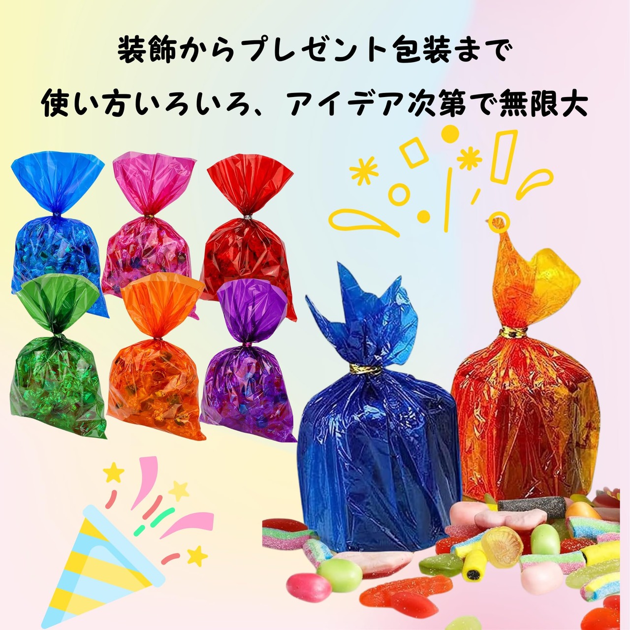 【多用途な活用】このセロファンセットは、工作だけでなく、ギフトラッピングや装飾にも最適です。卒業式や誕生日などの特別なイベントに華やかさをプラスし、思い出に残る瞬間を演出します。多様なシーンで活躍する万能アイテムです。