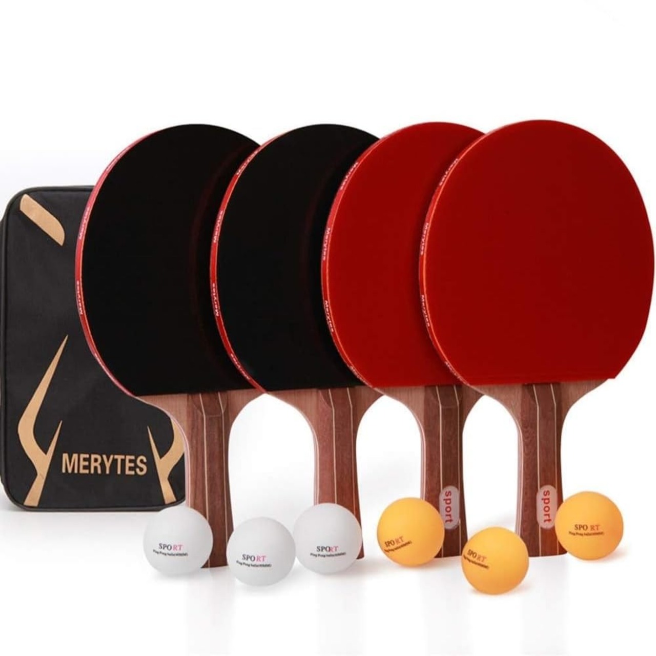 優れた卓球セット --- 4本の卓球ラケットと6つの耐久性のある卓球ボール。ラケットのブレードには黒と赤の色のラバーを貼ってあり、ボールは白が3つとオレンジが3つあります。そのため屋内でも屋外でも卓球の試合を楽しむことができます。