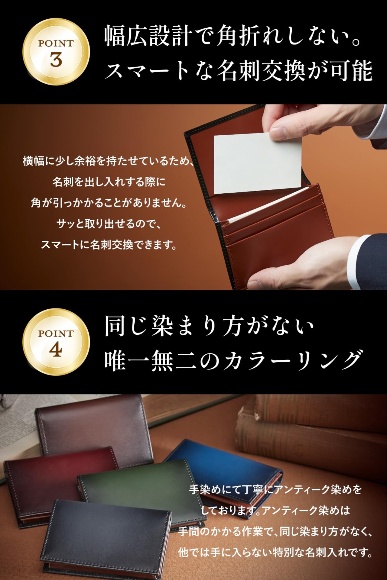 【同じ染まり方がない唯一無二のカラーリング】手染めにて丁寧にアンティーク染めをしております。アンティーク染めは手間のかかる作業で、同じ染まり方がなく、他では手に入らない特別な名刺入れです。