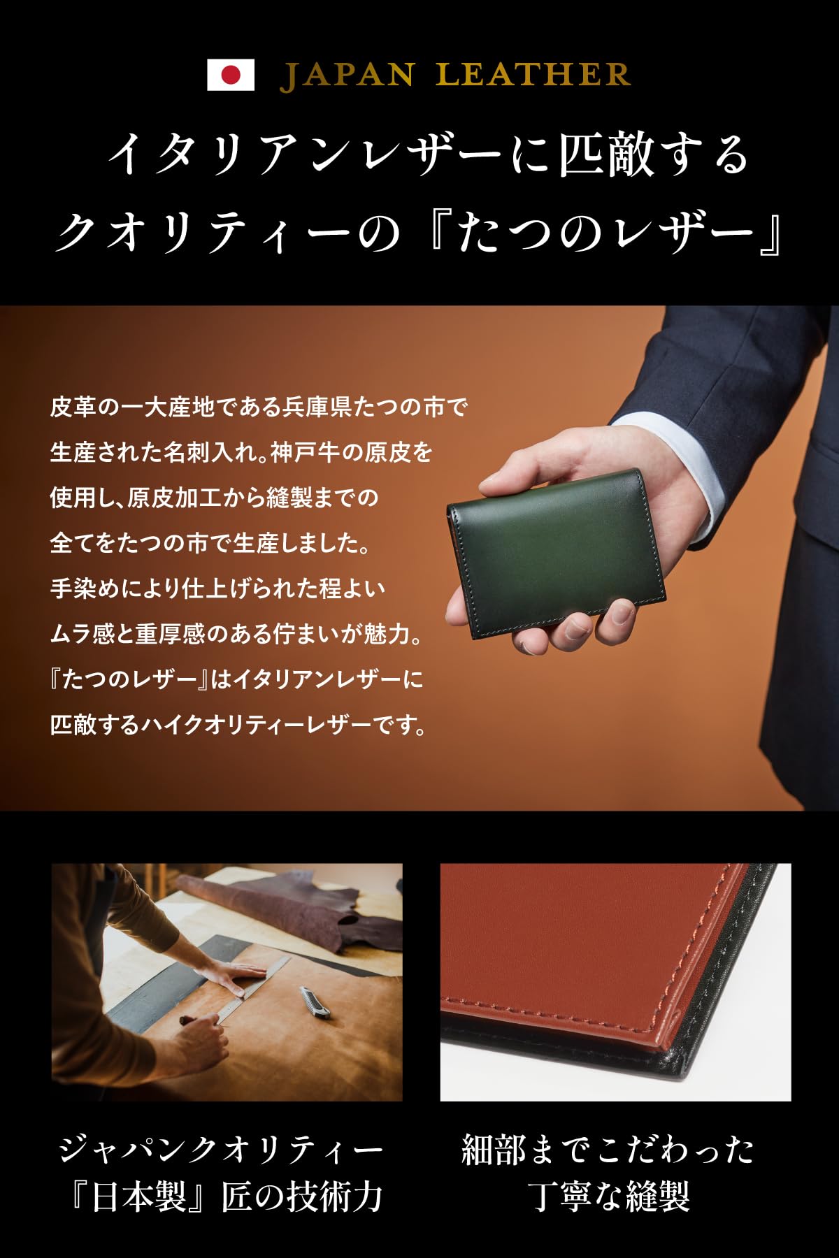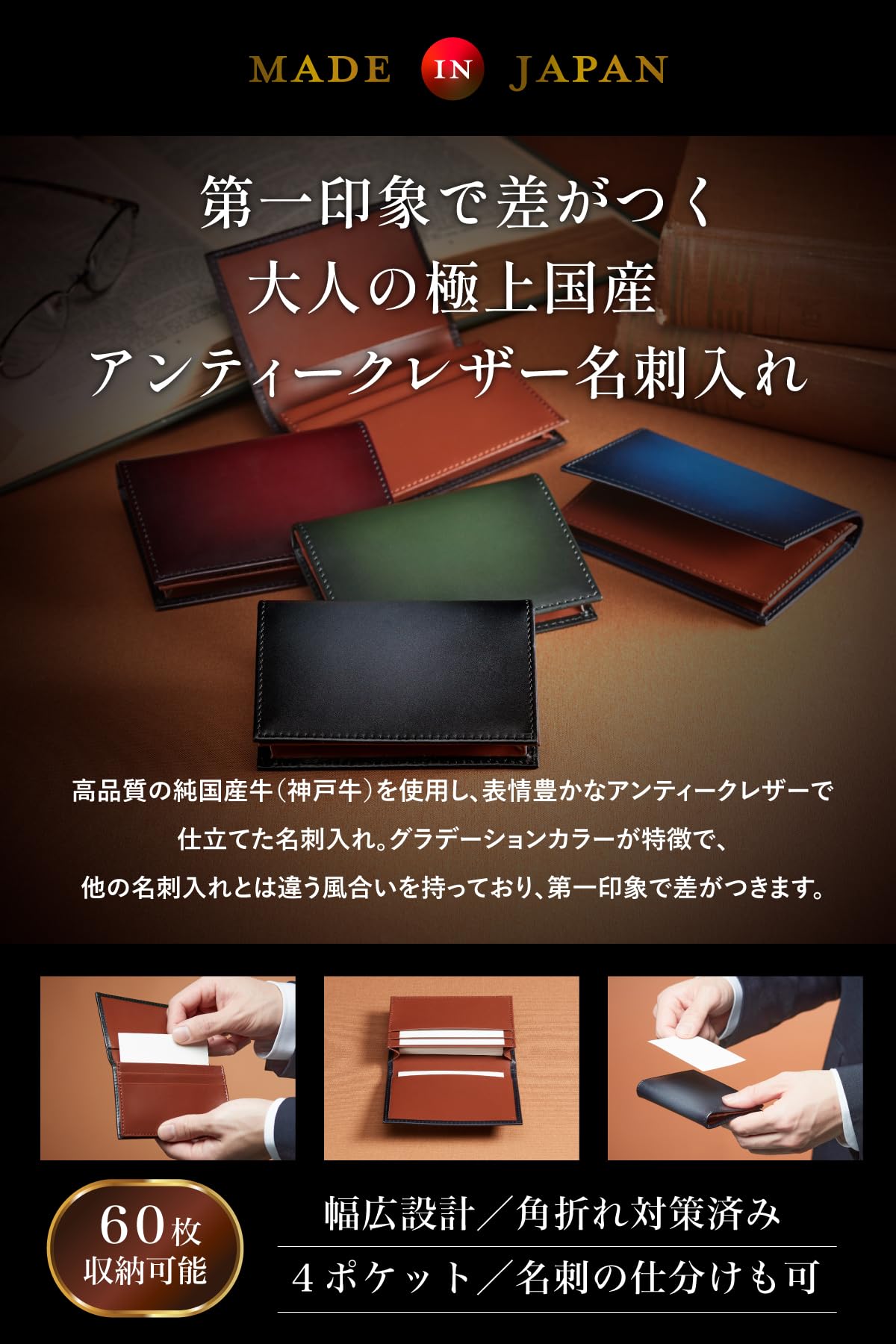 【日本製/大人の国産アンティークレザー名刺入れ】高品質の純国産牛(神戸牛)を使用し、表情豊かなアンティークレザーで仕立てたメンズ本革名刺入れ。グラデーションカラーが特徴でスタイリッシュで高級感があり、他の名刺入れとは違う風合いを持っており、第一印象で差がつきます。