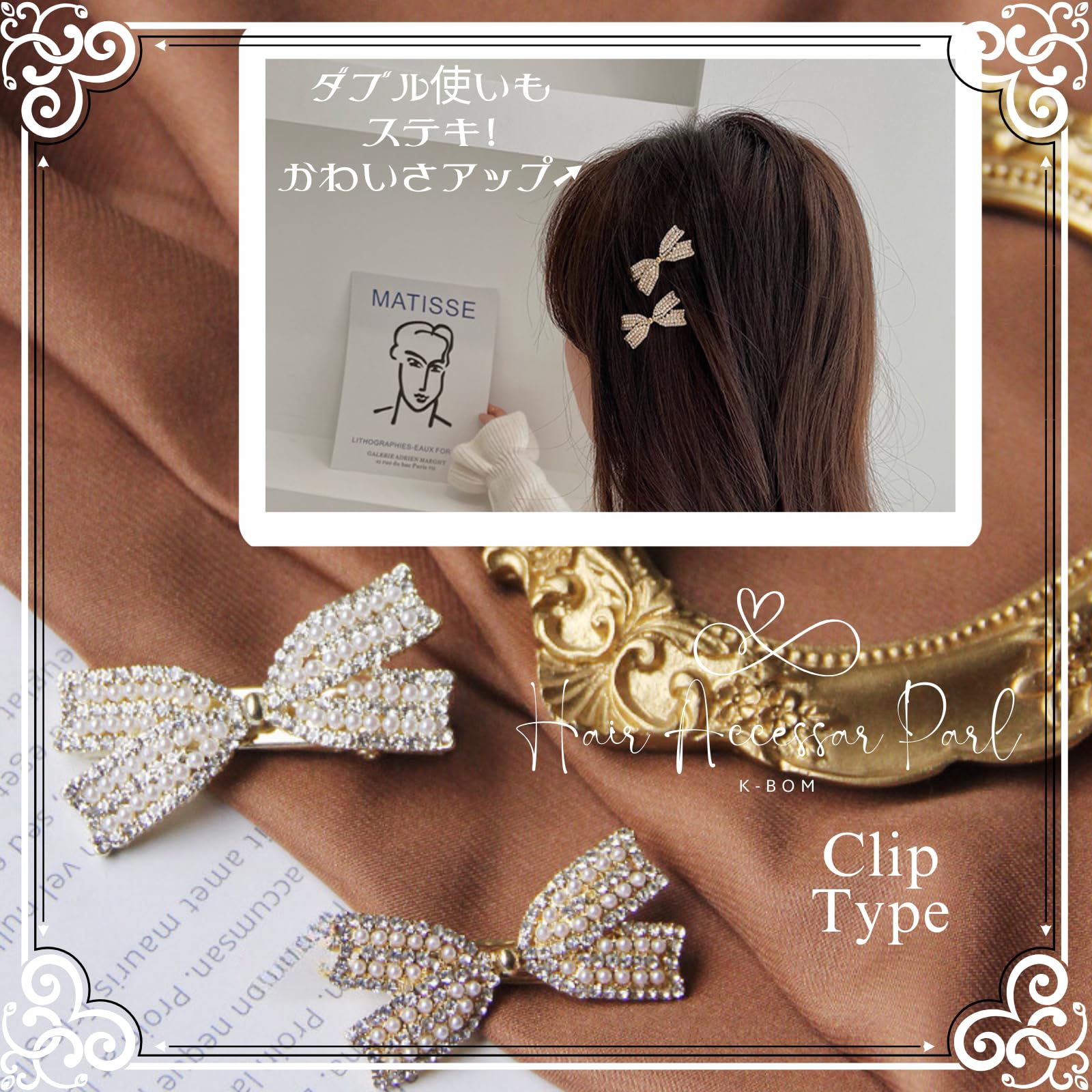K-Bom パール ヘアクリップ リボン バレッタ 5×2センチ 小さめ ヘアアクセサリー ビジュー 髪留め 髪飾り ヘアアレンジ 結婚式 卒業式 お呼ばれ 上品 簡単装着 ガールズ 大人女子 (クリップM)