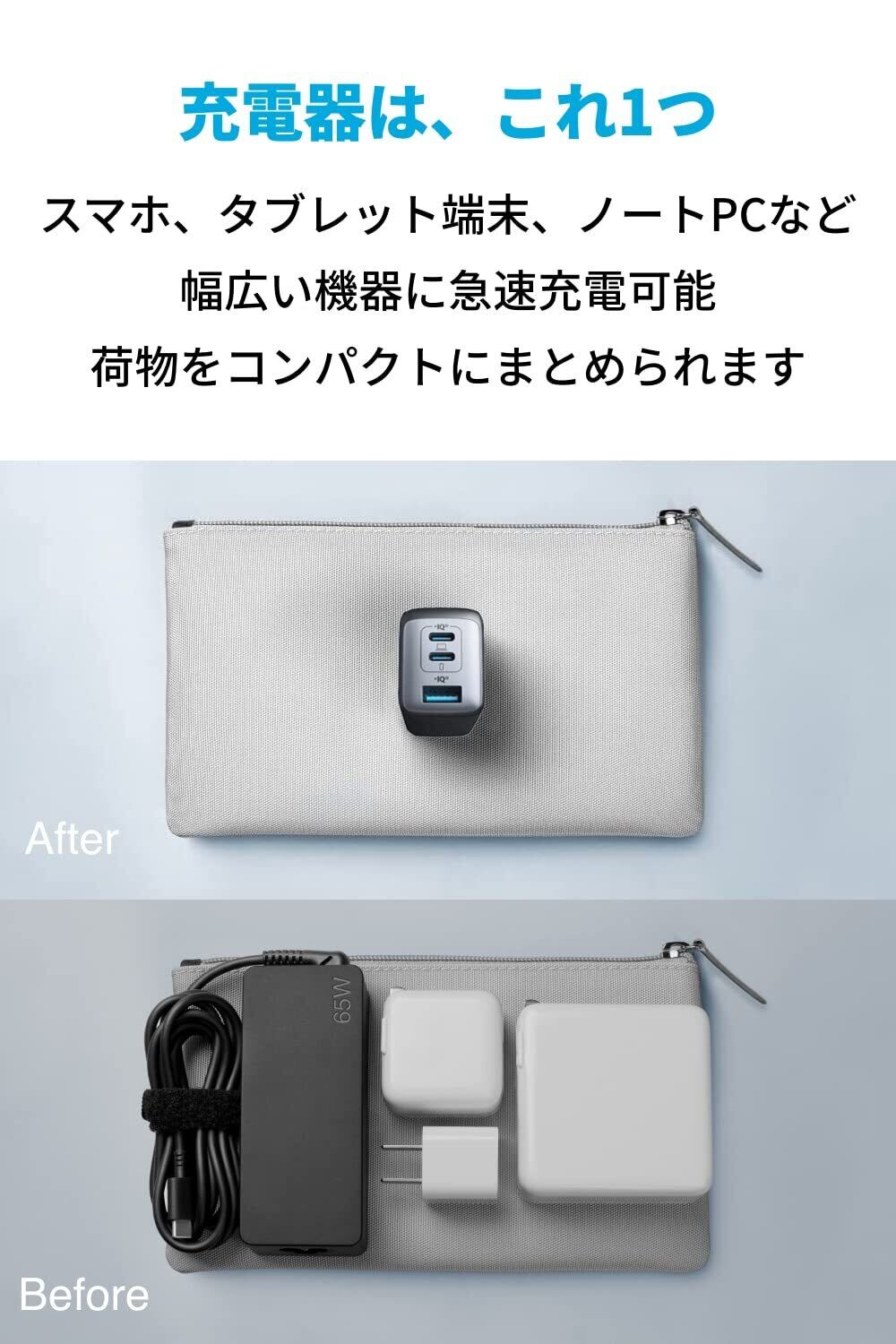 3台同時に充電可能:スマートフォン、タブレット、MacBook、USB PD対応のWindowsノートPCなど、多種多様なデバイスを一度に充電可能。PowerIQ 3.0 (Gen 2) を 搭載した2つのUSB-CポーとAnker独自技術PowerIQ搭載のUSB-Aポートを備えています。3ポート利用時の合計最大出力は65Wと高出力。機器毎に異なる充電器を持ち運ぶ必要はありません。※3ポート利用時の合計最大出力は64W