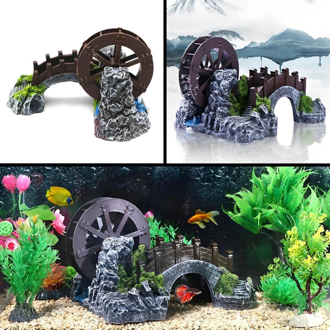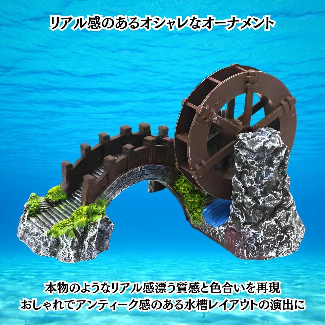 【リアル感漂うおしゃれなオーナメント】石造りの太鼓橋と水車をモチーフにした、風流なアクアリウムオーナメントです。独自の塗装技術により、本物のようなリアルな質感と色合いを再現しております。アンティーク感のある、おしゃれな水槽レイアウトの演出に最適です。