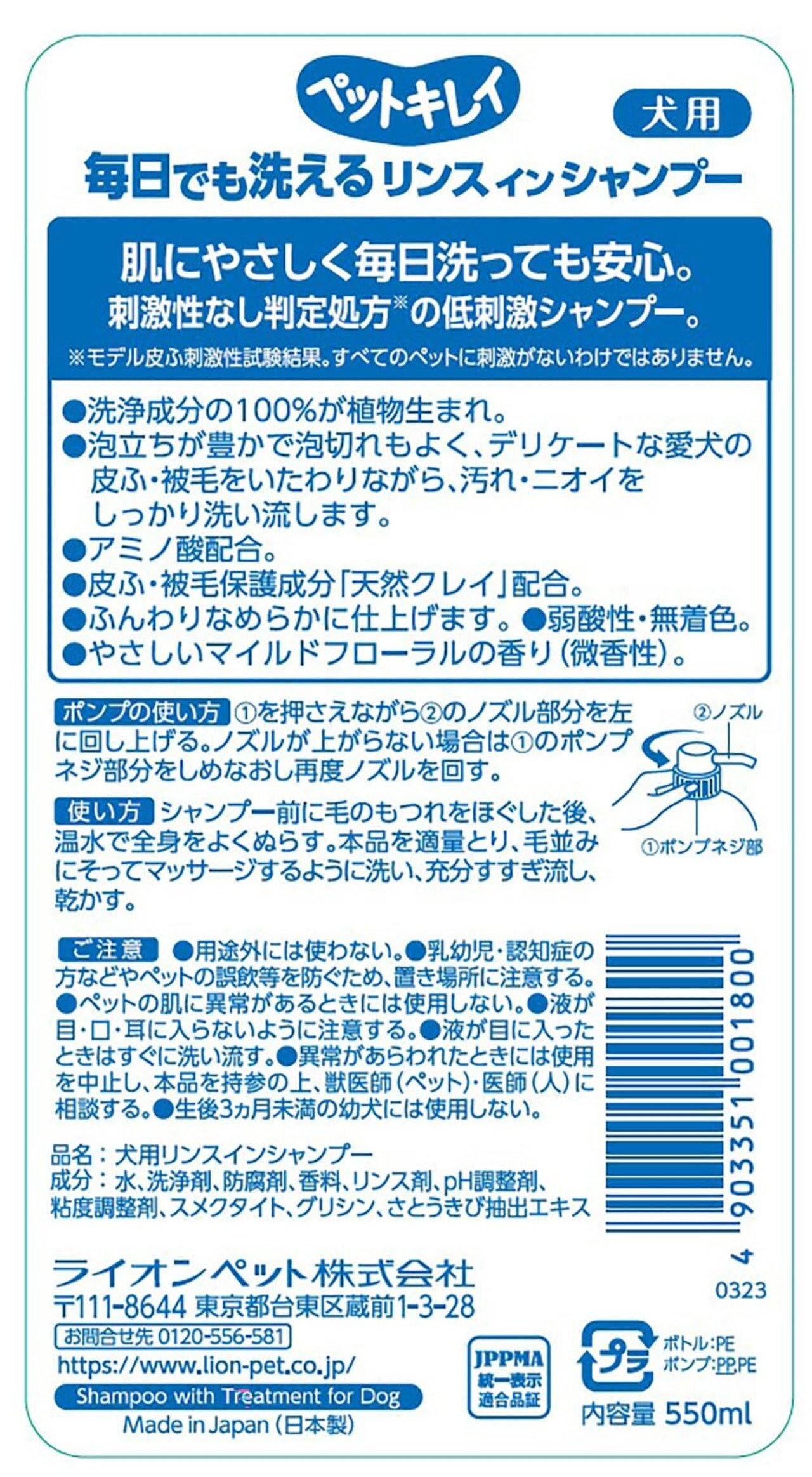 ライオン ペットキレイ 毎日でも洗えるリンスインシャンプー愛犬用 ポンプ 550ml LIONPET