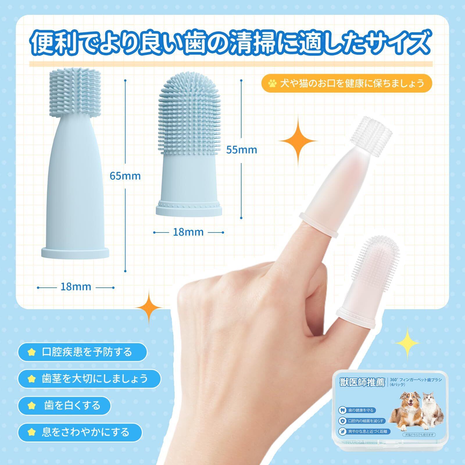 【犬用歯ブラシ 360度设计】私たちの犬のブラッシングは、犬がより柔軟に歯を磨くのに役立ちます。 長さ:55mm 内径:約18mm。360度のデザイン、指にフィットしやすく、操作も簡単です。 歯のクリーニングはより穏やかで簡単になります。 また、ペットの歯の裏側をきれいにするのにも役立ちます。 これは猫の歯のケアと猫の歯のケアに適用されます。
