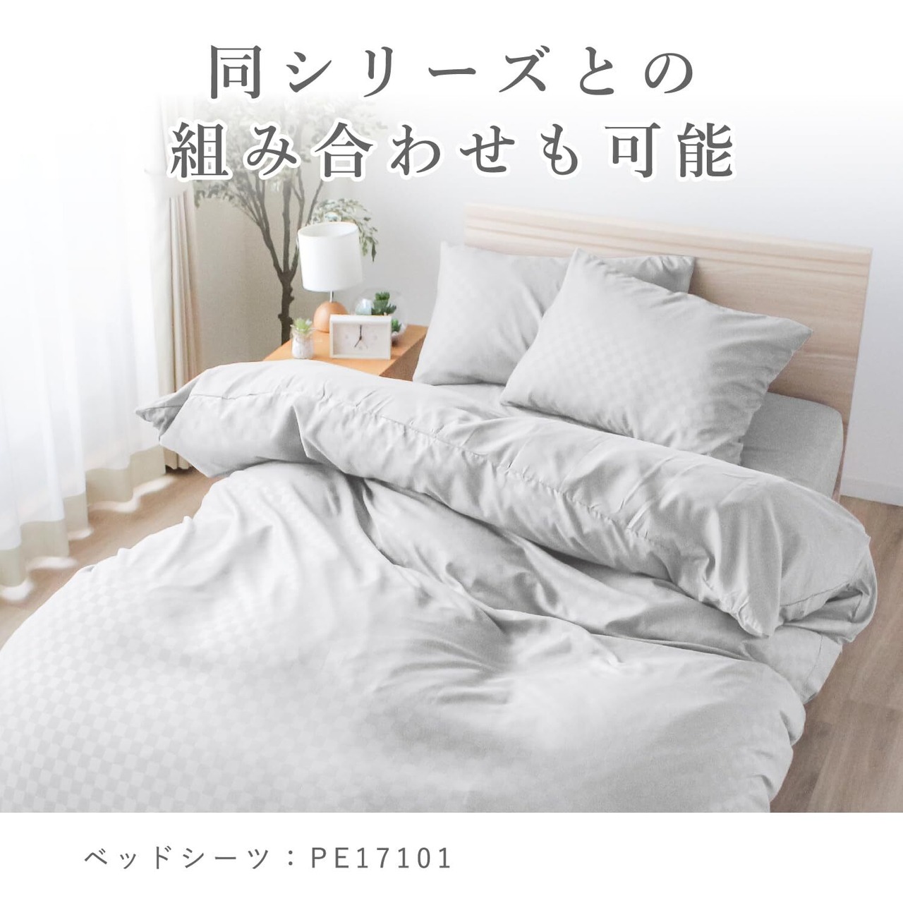 単色だが光の加減で市松柄が現れるモダンテイストの布団カバー。一見、無地のカバーにも見える柄が和洋室どちらの部屋にも合わせやすくなっています。