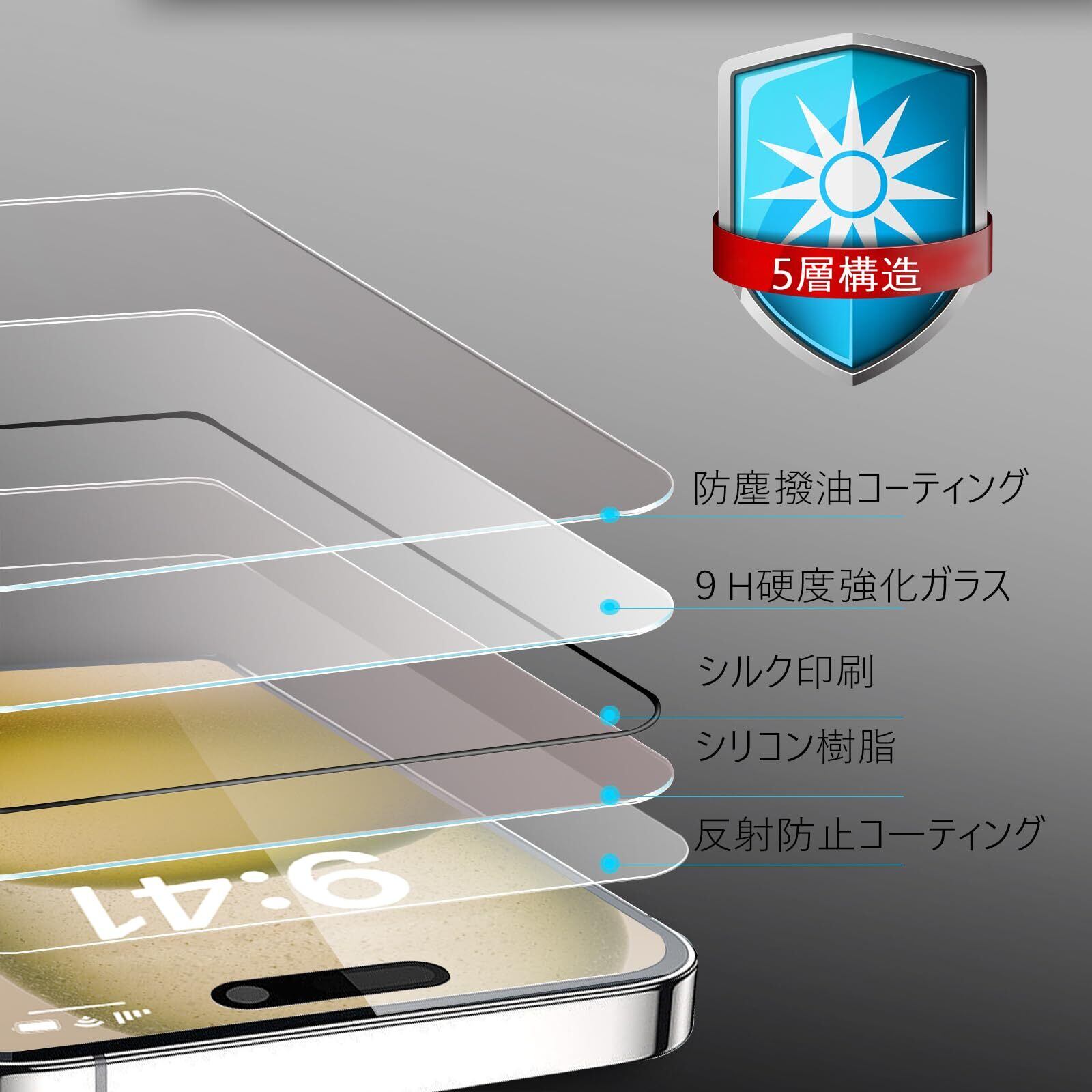 【対応機種】 iPhone 15 用(6.1インチ対応)。 【パッケージ内容】 iPhone15 ガラスフィルム * 2枚セット + iPhone15 カメラフィルム * 2枚セット + ガイド枠 * 1枚。