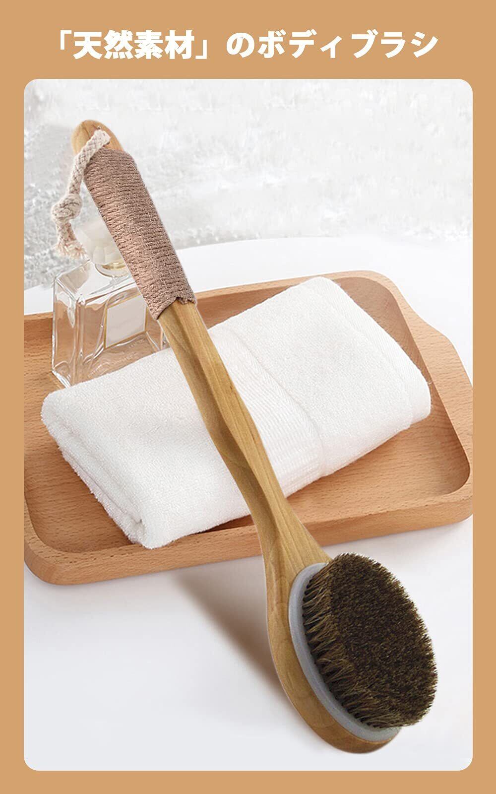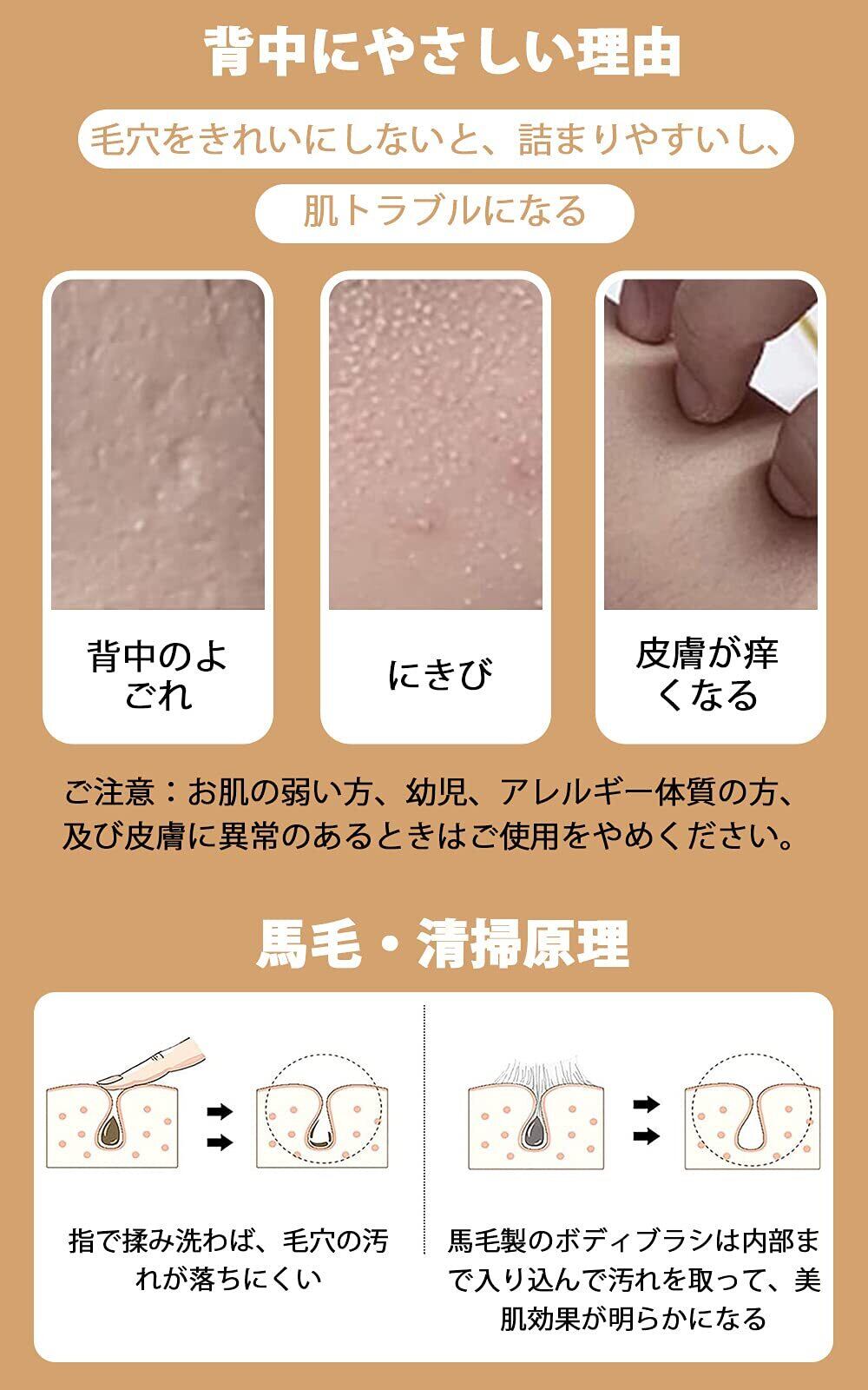✨「両方用のボディブラシ」:柔らかすぎず硬すぎず馬毛なので、風呂用またはドライブブラッシング用としてお使えていただきます。お風呂の最中に、背中をゴシゴシ洗いたい人や毛穴汚れをキレイにしたい方にオススメです。●肌もブラシも干した状態で全身をブラッシングして、お肌に優しくて、女性に対しては大人気です。