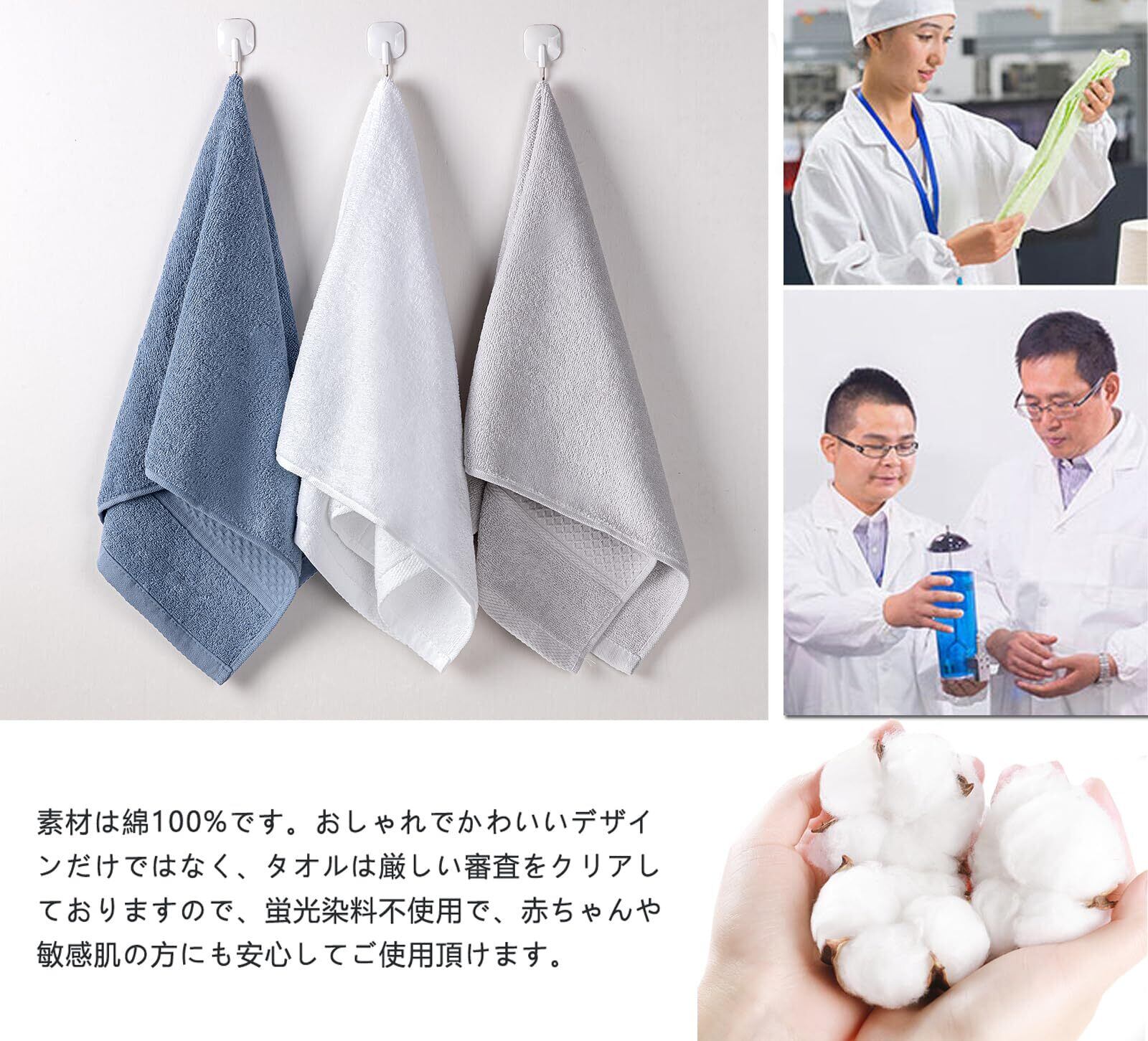 【厳選された綿100%の素材】素材は綿100%です。染色堅牢度は4級に達し、色移りや毛羽落ちがなく、何回洗濯しても変形しなくて、超長持ちタイプです。おしゃれでかわいいデザインだけではなく、タオルは厳しい審査をクリアしておりますので、においがありません、蛍光染料不使用で、赤ちゃんや敏感肌の方にも安心してご使用頂けます。