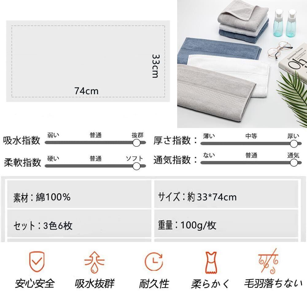 【フェイスタオル 6枚セット】素材:綿100%、サイズ:約33×74cm、重さ:約100g(1枚)、セット内容: グレー2枚、ホワイト2枚 、ブルー2枚。
