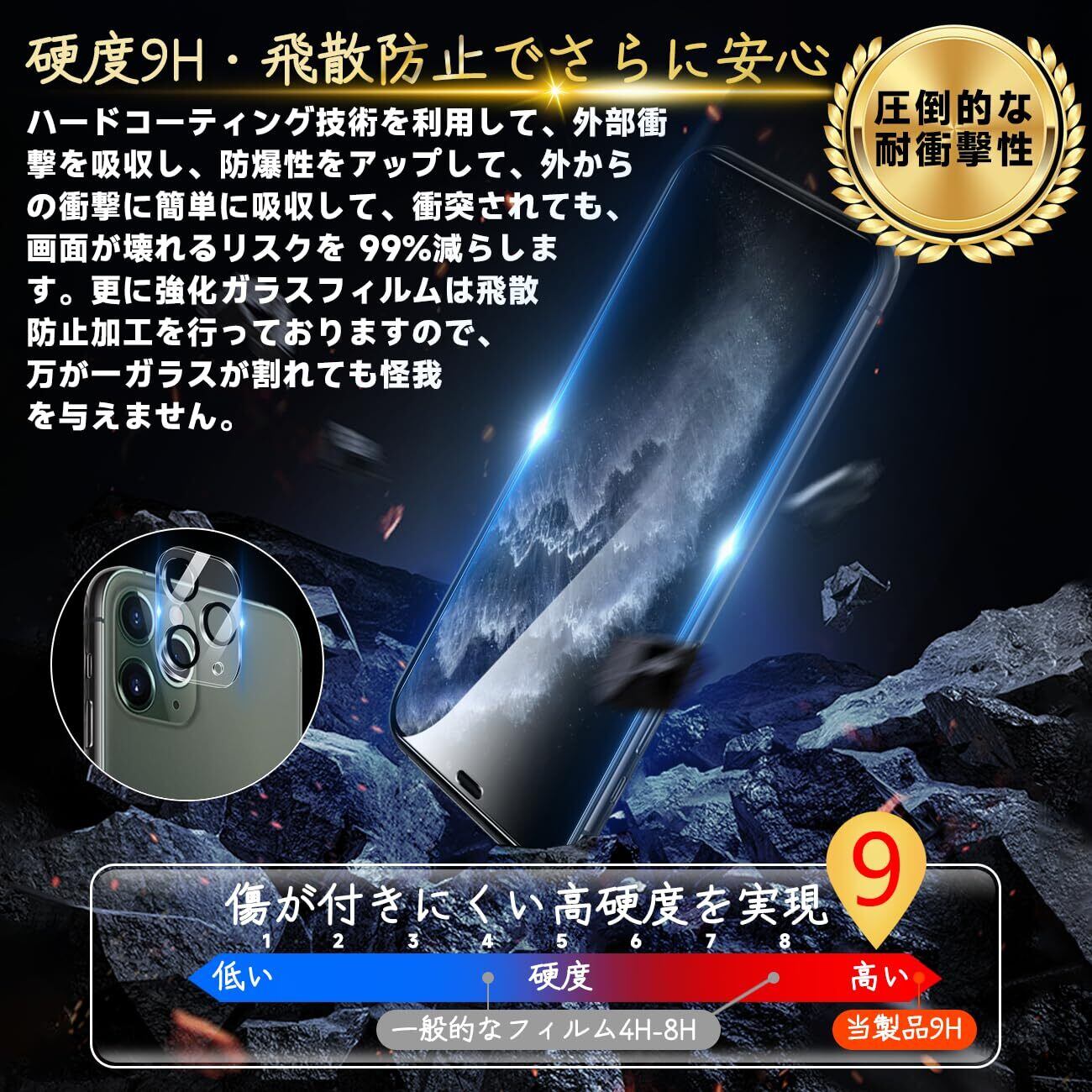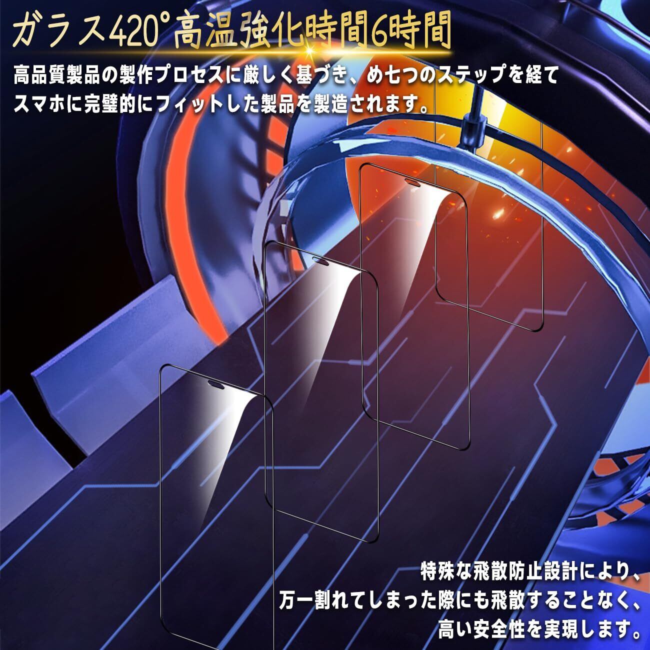 【高品質材質・9H硬度】 ガラスフィルムとレンズ保護フィルムはすべて旭硝子で作られており、スマホ保護フィルムの中で最高レベルの9H硬度に達します。しかも4.5時間以上の高温焼入れ処理を行い、スクリーンプロテクターの圧強度は125mpaに達し、通常 ガラス の 5 倍になりました。スクリーンプロテクターは衝撃を抑えるシリコンコーティングを内蔵しており、万が一ガラスが割れても、ガラスの破片が飛散しません。ハードコーティング技術は、衝撃を最小限に抑えて画面の破損を防止し、すり傷防止や指紋防止もしっかりしております。*大切な携帯電話の液晶画面を保護し、衝撃や表面のキズを防止します。