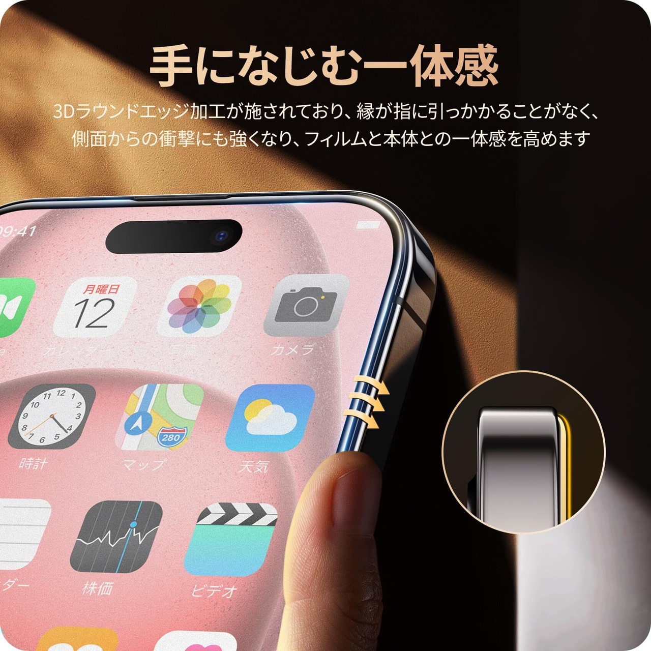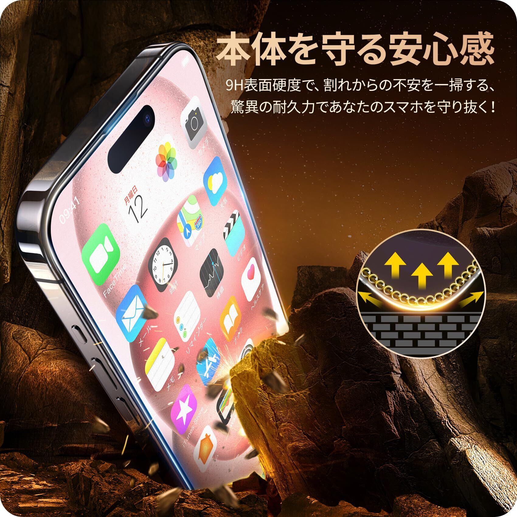 【黒縁全面保護・耐衝撃性アップ】黒縁取りでスマートフォンの画面をフルカバーして、落下や衝撃による損傷からスマートフォンを守ります。9H表面硬度ガラスを採用し、スマートフォンがカバンの中で、鍵などの鋭いものにぶつかっても傷が付きにくく、アイフォン 15 の画面をしっかり保護します!また、飛散防止加工により、万一割れてもガラス破片が飛び散ることなく安心です。