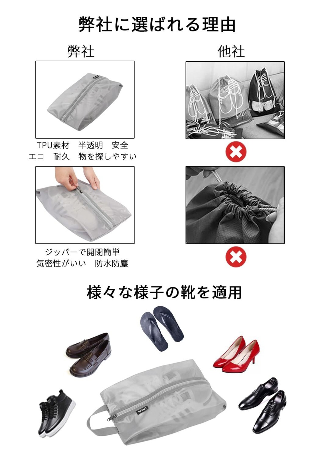 【デリケートな縫製 多機能】】シューズケースは全体にTPU(熱可塑性ポリウレタン)素材で作られて、高品質のYKKジッパーとこの上なくスムーズなジッパーの歯で、スムーズに開け閉めできます。ですので、簡単に壊れることはございません。ジッパーを中央にすることで簡単に物の出し入れができます。4種類の色からお好きなものをお選びいただけます。男女問わずご利用いただけます。 旅行、出張ではなく、山登り、スポーツ、ジム、遠足、キャンプなど靴の収納には非常に便利で、靴を入れて持ち運ぶことは簡単です。それだけでなく、化粧品や服などにも使え、家用の小物入れとしてもとても便利です。旅行用の収納バッグとしても、家用の防塵袋としても良いです。
