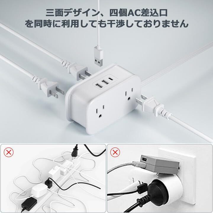 1台7役USB-C付き電源タップ:4個AC差込口、1つType-Cポートと2つUSB-A 1ポートを搭載し、最大7台デバイス同時に充電可能です。また、ACコンセントが前後に分散しているため、使用時に干渉を防ぎながら接続可能です。
