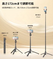 三脚/一脚兼用&最長172㎝まで伸縮可能:スマホ三脚と自撮り棒を一体化され、底部のボタンを押すと便利に三脚に展開し、コンパクトで様々なシーンに適応します。折りたたんだ時の長さは30cm、重量311g(ホルダー含む)、最長172cmまで伸びることができます。持ち運びに便利なだけでなく、背の高い人にも苦労せず撮影できます。